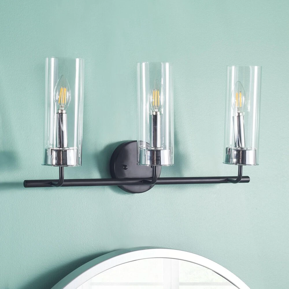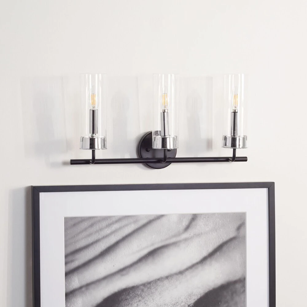 A contemporary update of the classic hurricane lamp, this Gannon Vanity Sconce sheds soft light into any interior. Gannons matte black frame dramatically juxtaposes with its nickel finished chrome bases, beautifully holding aloft three candle inspired lights for a touch of timeless charm.