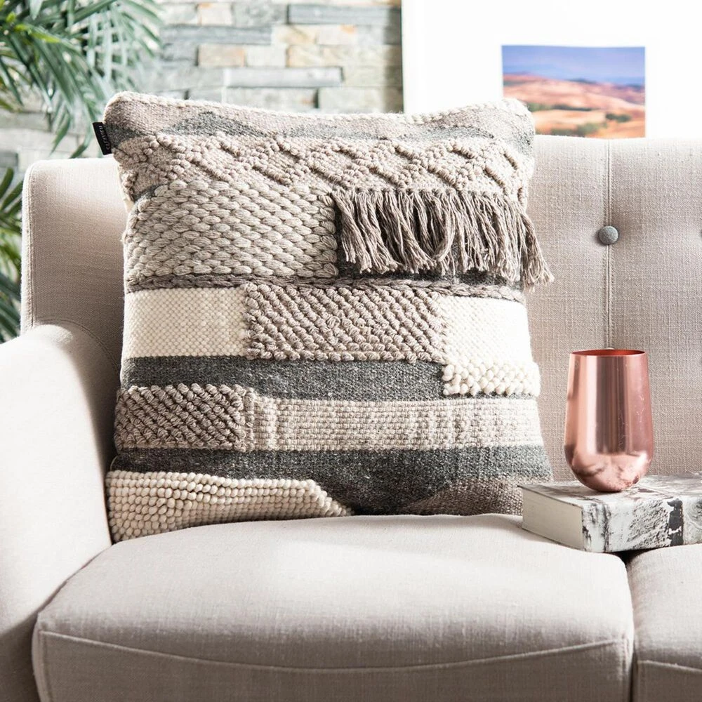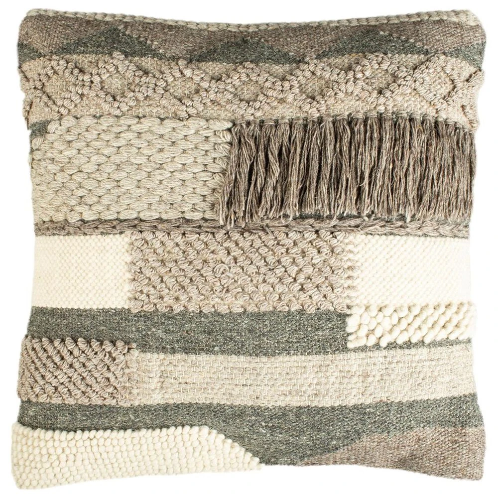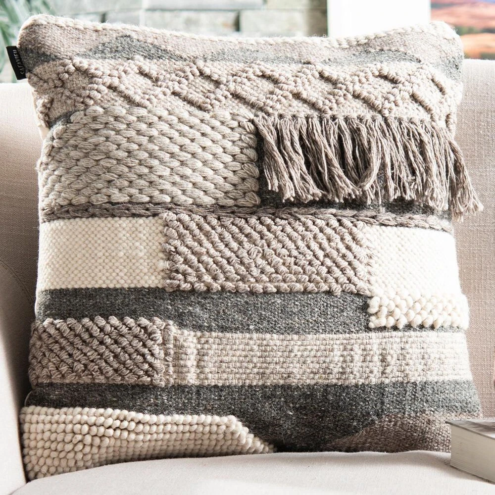 Inspired by the earthy textures of nomadic dwellings, the Gareth Pillow cover is adorned with warm wool stitching, breezy cotton fringe and chunky loop knitting. Steely, mineral tones heighten the casual ambiance of this accent pillow, making Gareth a wonderful choice for the boho living room or serene bedroom. A hidden zipper on the back allows for easy cleaning and care.