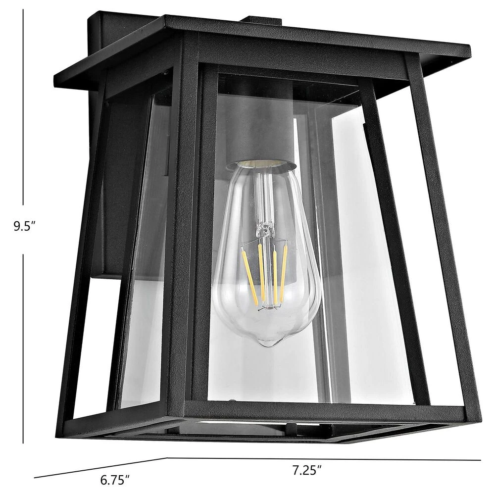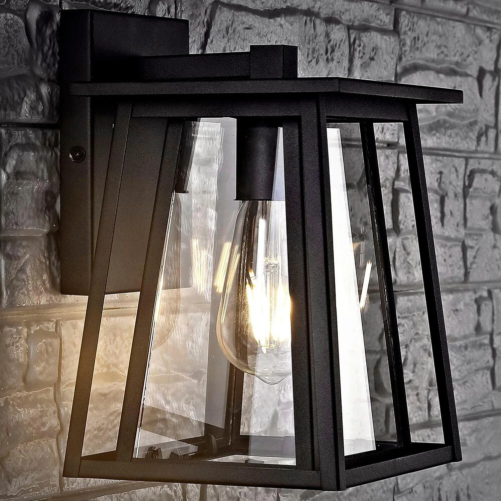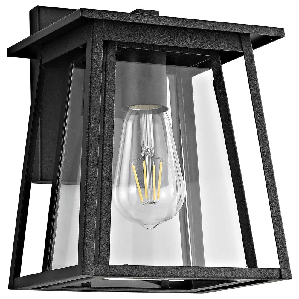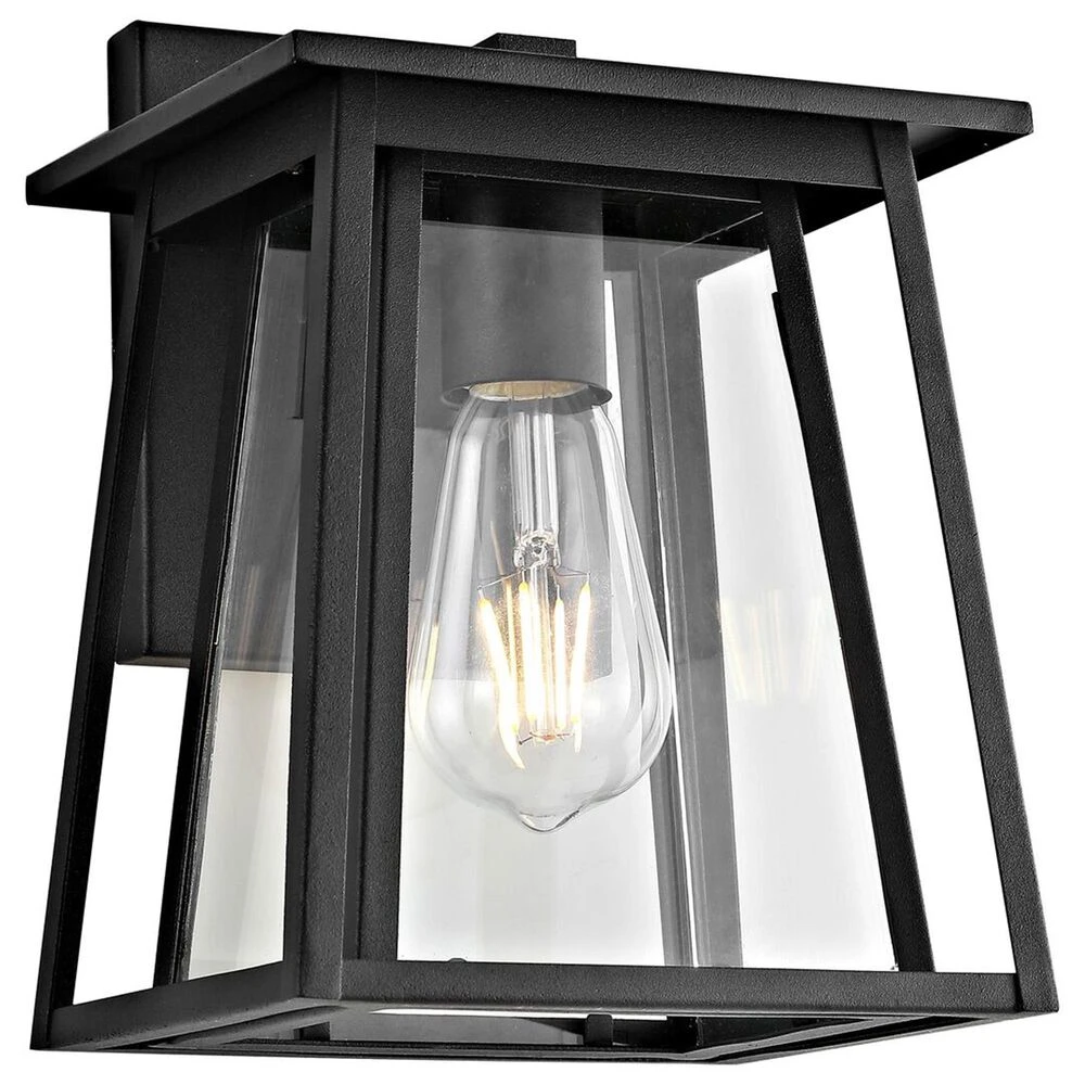 A modern marvel, this stunning contemporary outdoor wall lantern makes any exterior entrance grand. Its sophisticated inverted design features clean lines, clear glass and a sleek, durable black metal frame. Its single bulb lends a friendly, ambient glow.