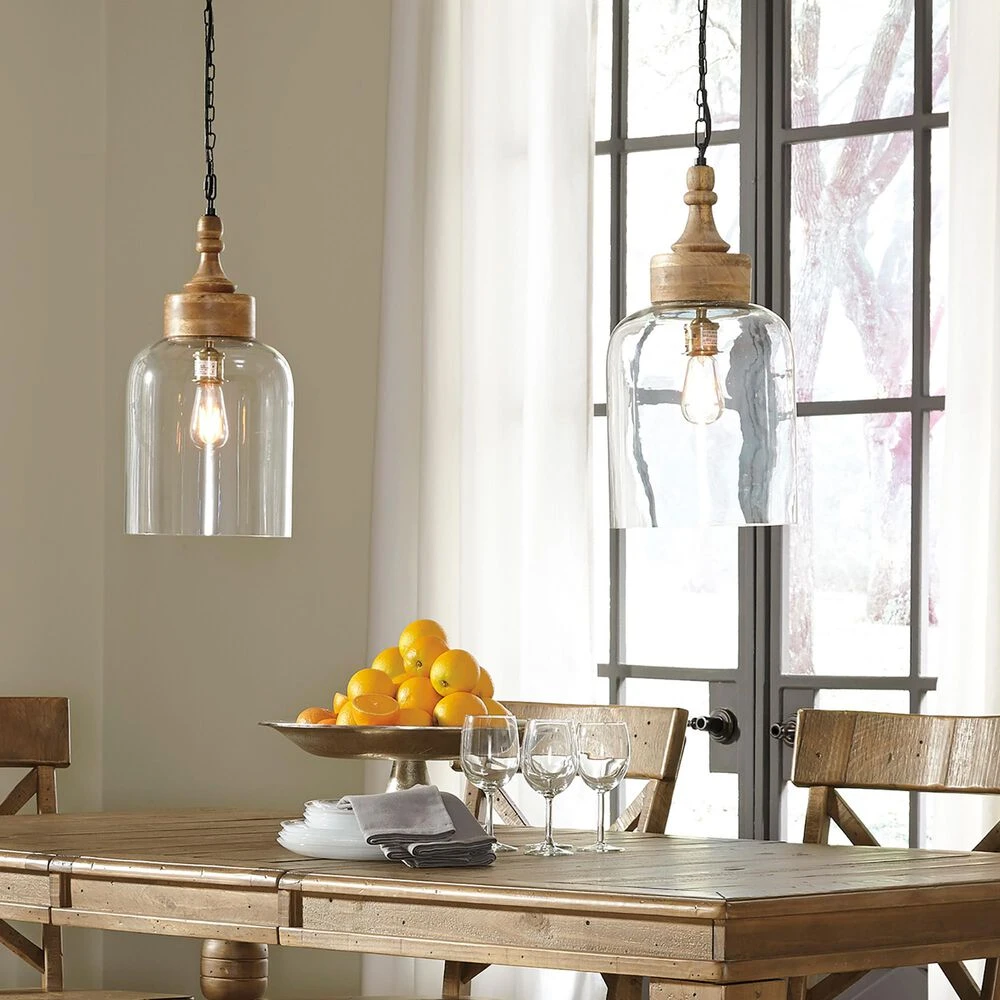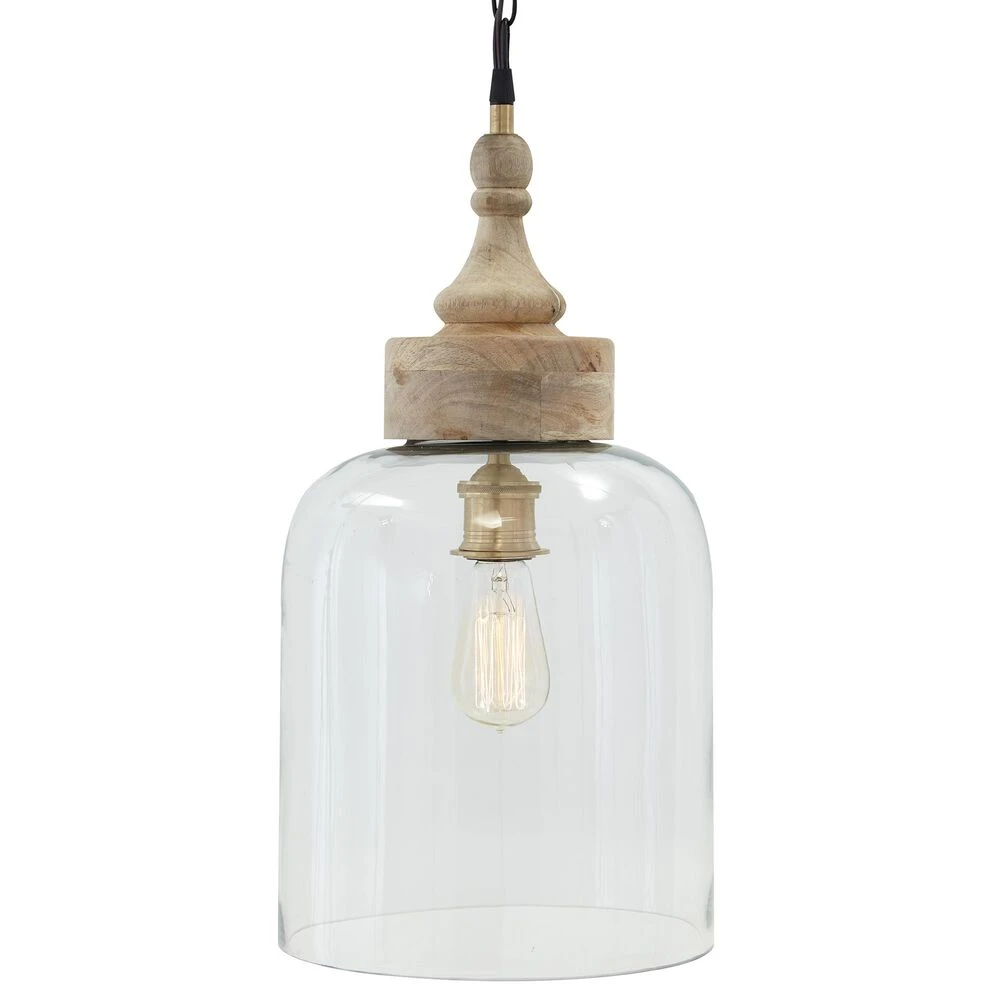 The mixed materials of this pendant light are right in line with the times. Turned wood finial crowns the alluring half-dome glass shade.
