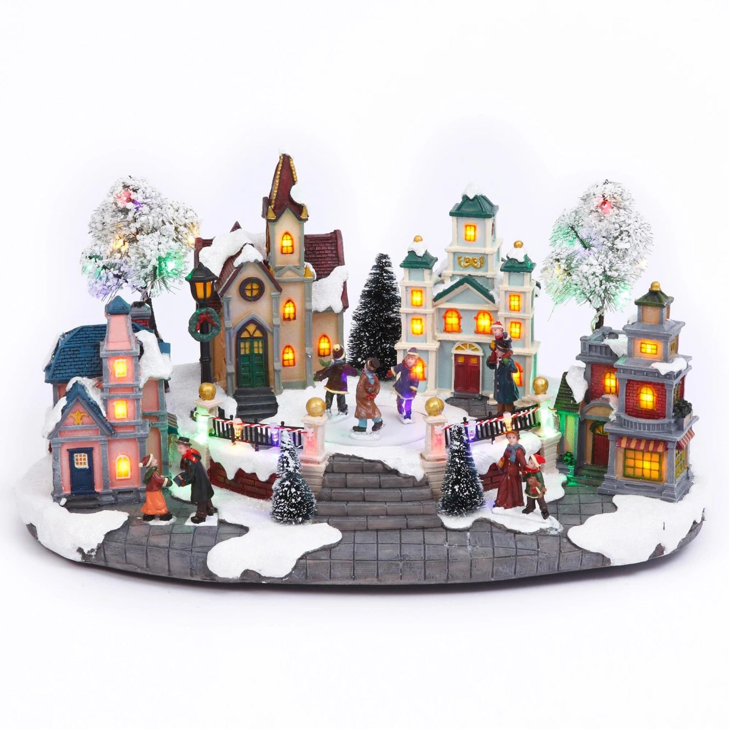 A 15.35-in long holiday scene from days gone by, this brightly light musical village is a delightful Christmas display. With snow covered streets, brightly lit homes and trees, and moving children playing around the tree in the town center while Christmas music plays. Powered by a UL approved adapter, 1.8m black cord.