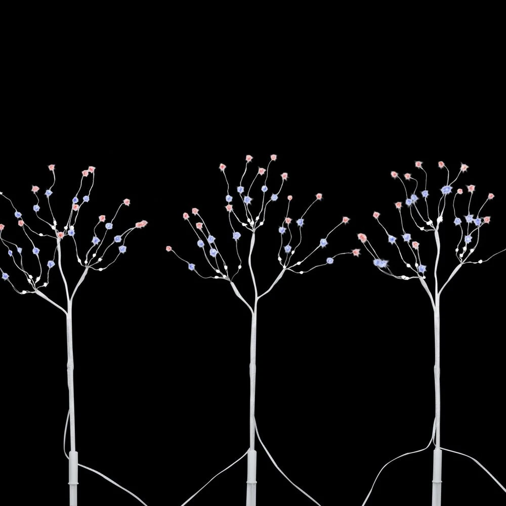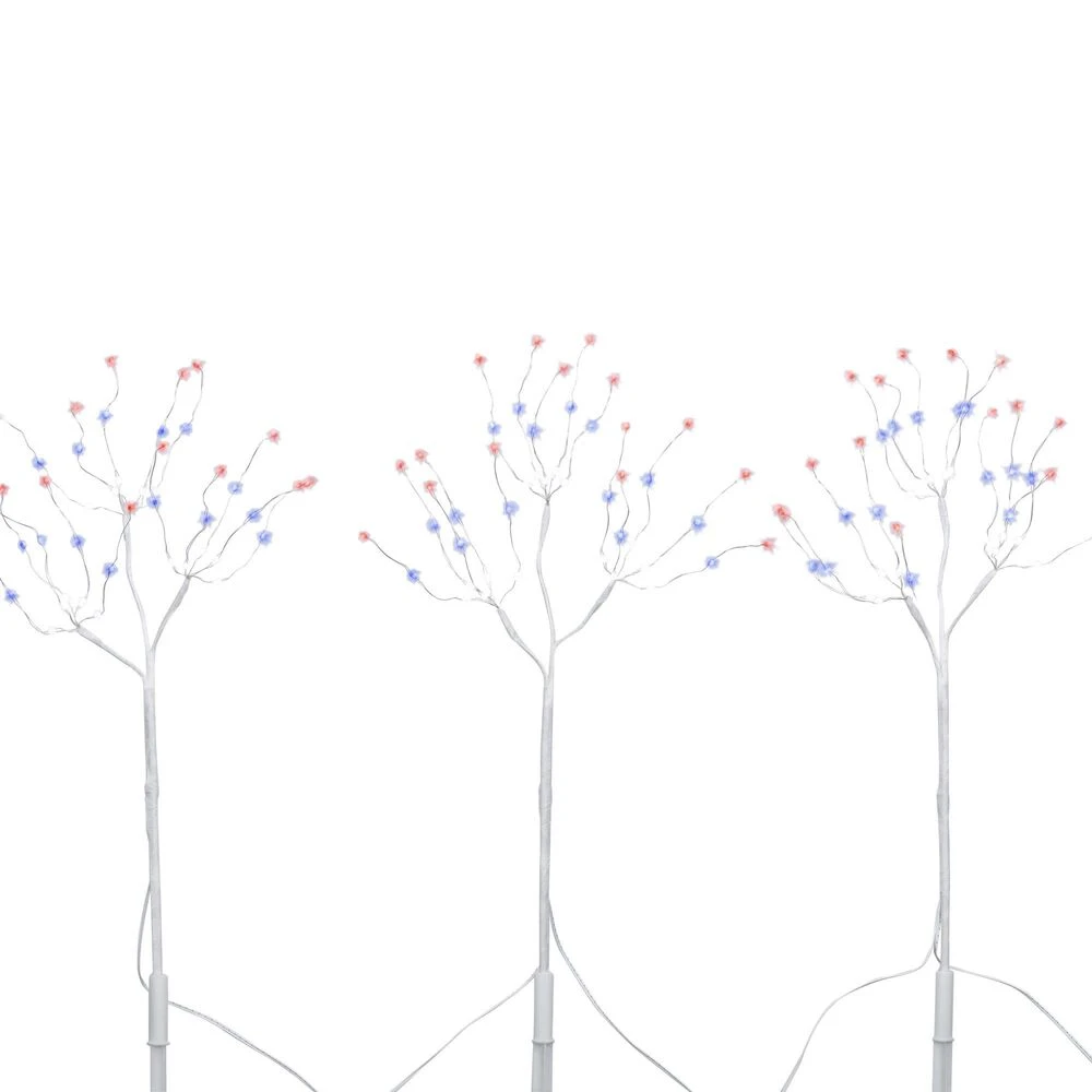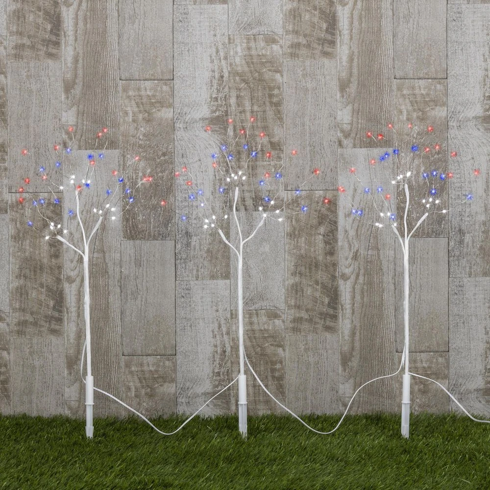 This set of 3 connected 19.68-in H white branch stakes are the perfect patriotic accent for any yard. Each branch has a firework effect with 45 red/white/blue LED lights (135 lights total). The three branches are connected by a white wire with 19.5 inch spacing and includes an outdoor battery box with a 6 ON /18 OFF timer function. 3 C batteries are required, not included. Suggested for outdoor use.