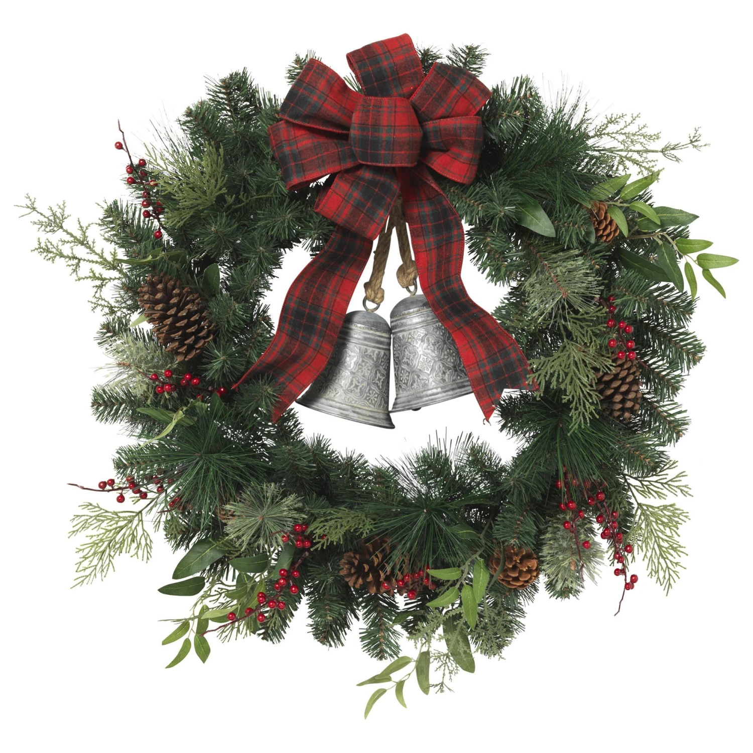 This 32-in wreath of faux pine accented with pine cones, berries and winter greenery is a statement piece! Topped with a red and black plaid ribbon 7 loop bow, with two silver bells hanging from jute cord in the center of the wreath. You will be sure to get lots of compliments when you display this beauty!