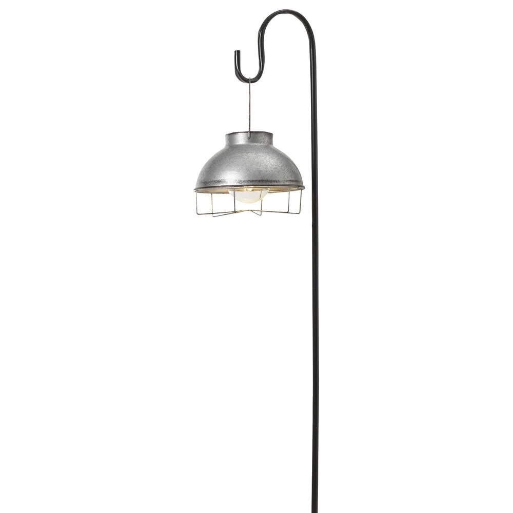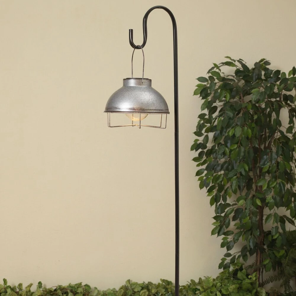 Illuminate your garden with this Solar Powered Metal Lamp! This Lamp features a Sliver Dome and a Cage around the light bulb, which gives it a retro look. This lamp sits at 43.3-in High, and includes a Shepherd Hook for hanging.