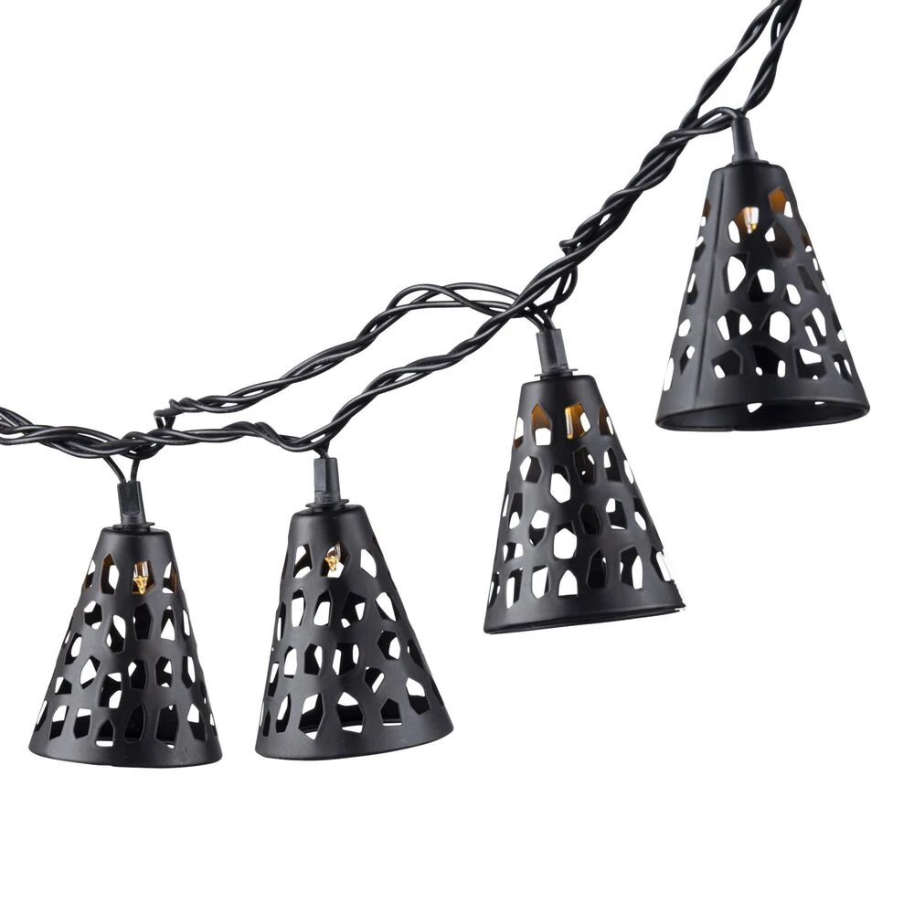 Electric 6-ft long patio lights with die-cut black metal covers. There are a total of 10 warm white mini LED bulbs with 8-inch spacing. An additional 24-inch black UL lead cord. Suggested for Outdoor use.