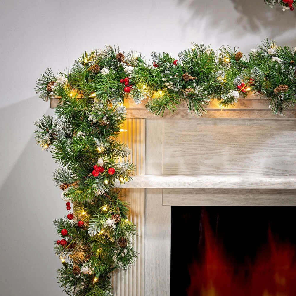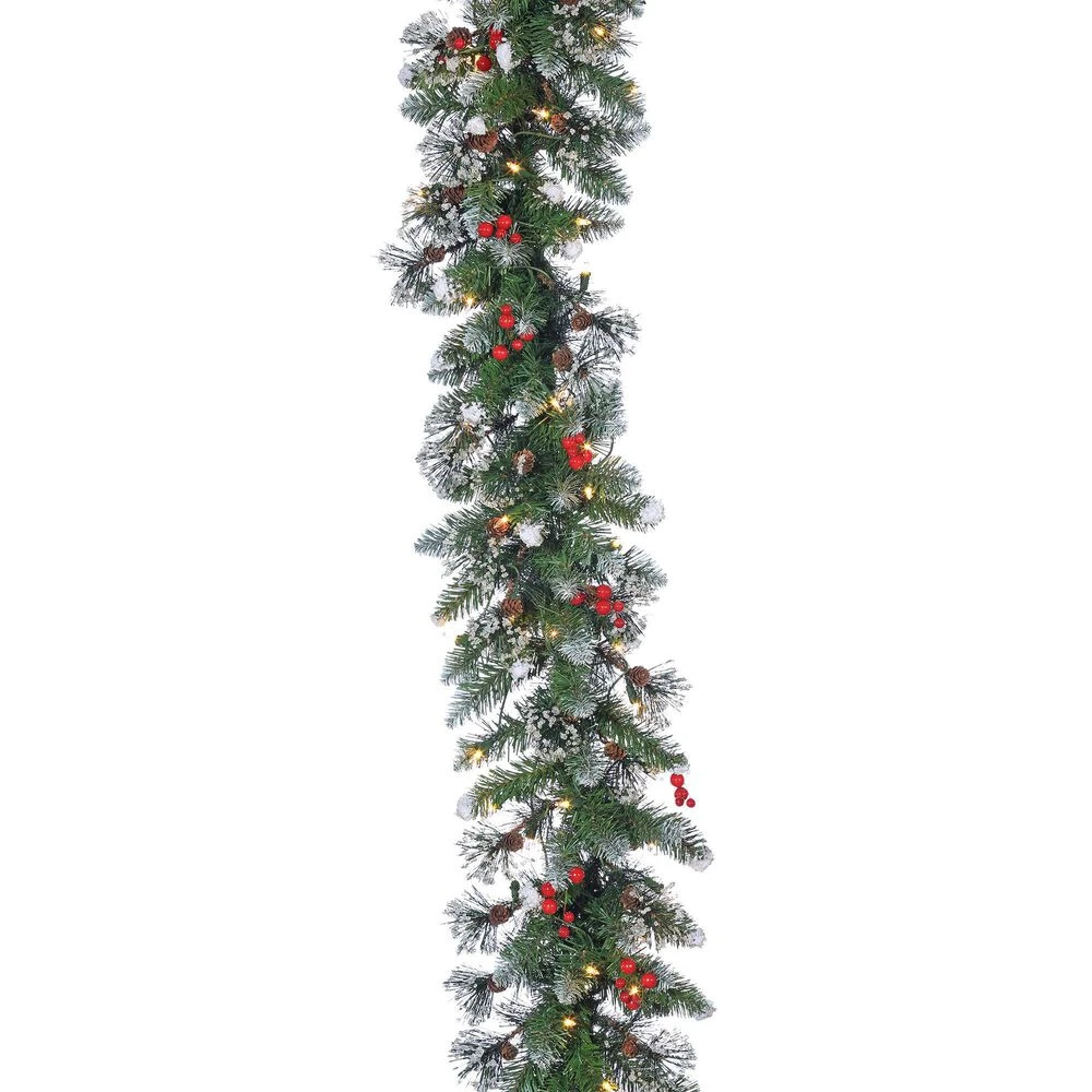 This 9-foot long pre-lit hard/mixed needle Glazier Pine garland is a delightful way to add beautiful holiday spirit to you home! Featuring 200 iced tips and accented by pine cones and clusters of red berries, it is lit by 100 UL White energy efficient LED lights to brighten where ever it is placed. Add festivity to any window frame, entryway, banister, mantle or other area of your home.