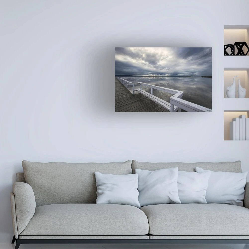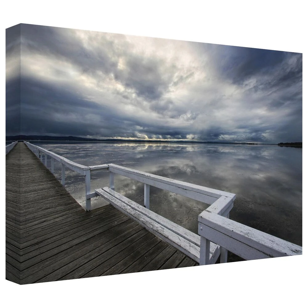 This ready to hang, gallery-wrapped art piece features a pier on a coast under a cloudy sky.