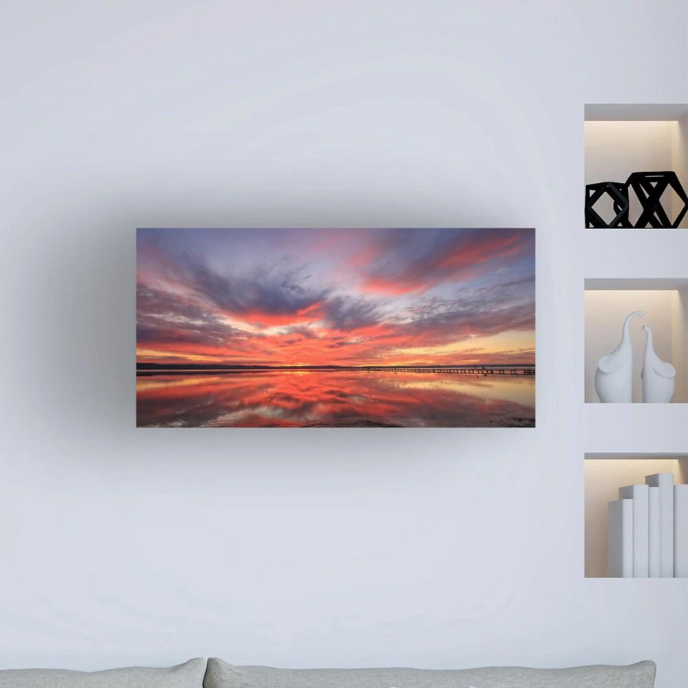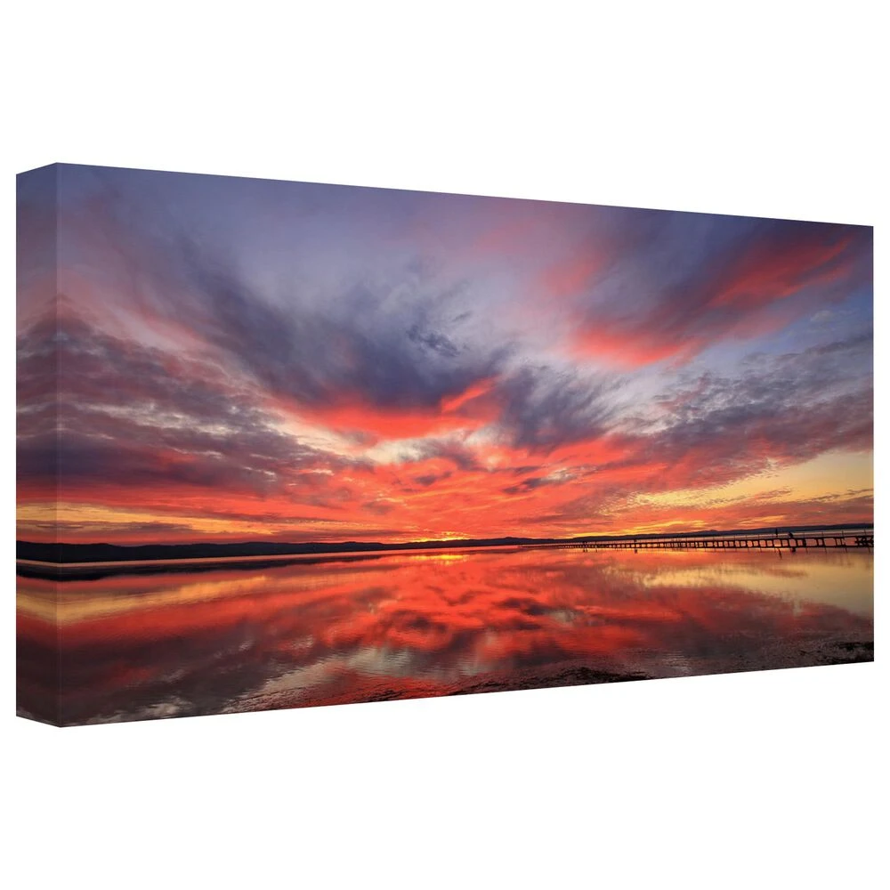 This ready to hang, gallery-wrapped art piece features orange light from a sunset over a coastline.