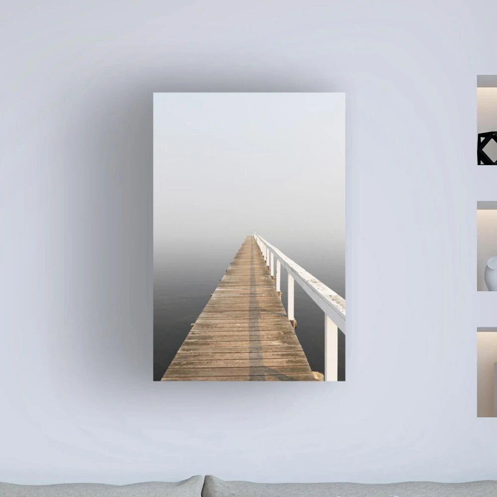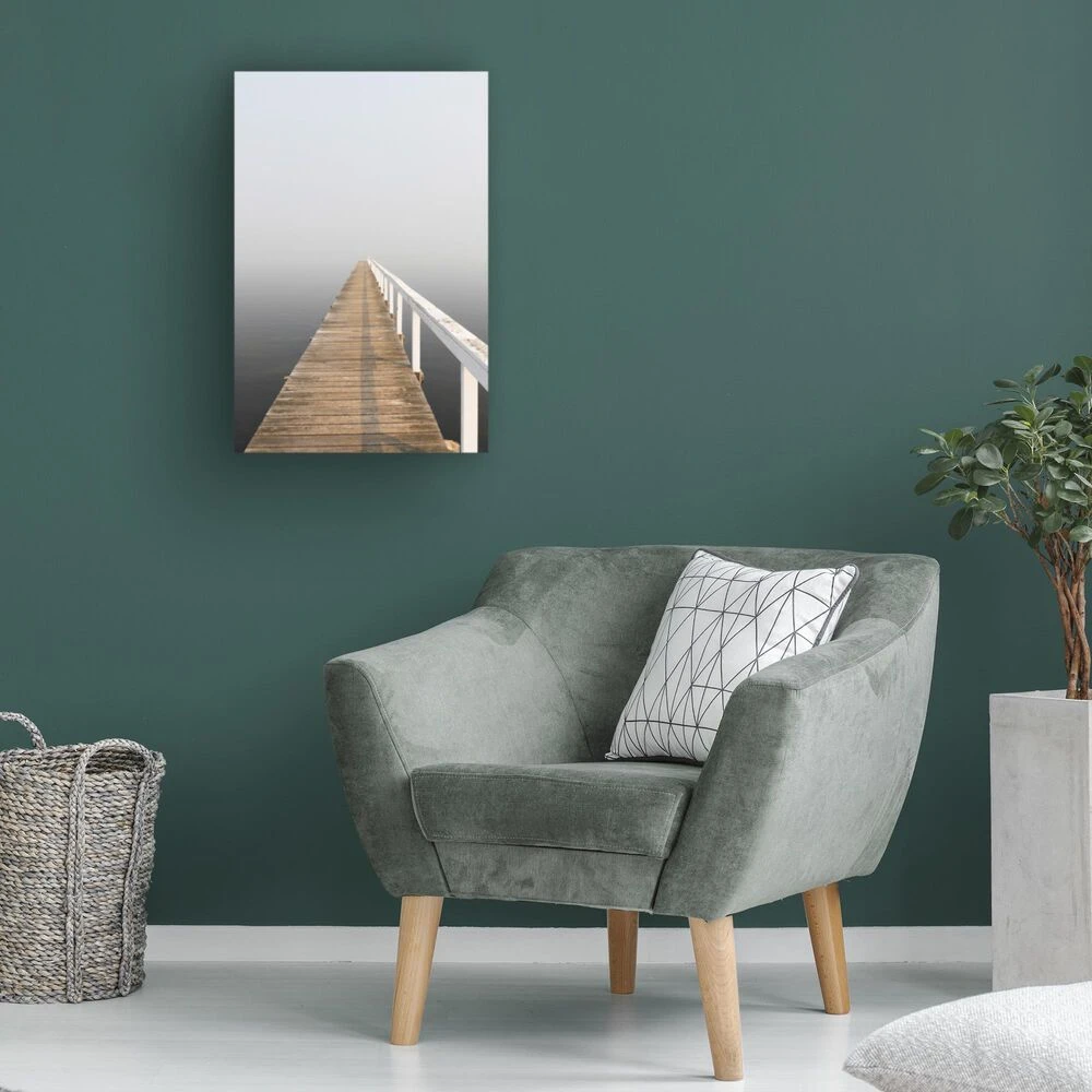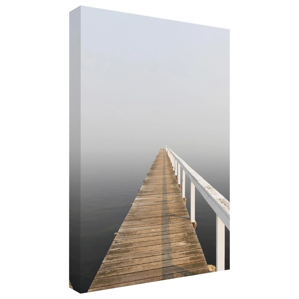 This ready to hang, gallery-wrapped art piece features a pier running down the center of the frame.