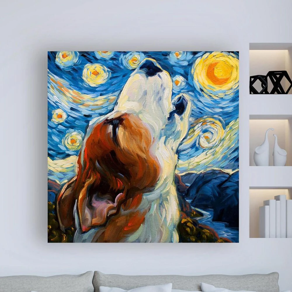 This ready to hang, gallery-wrapped art piece features a dog howling over starry night.