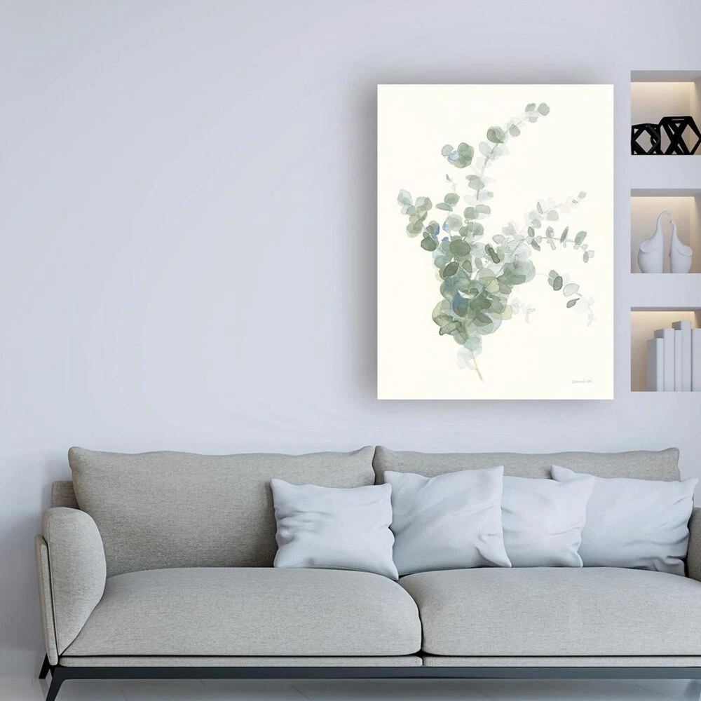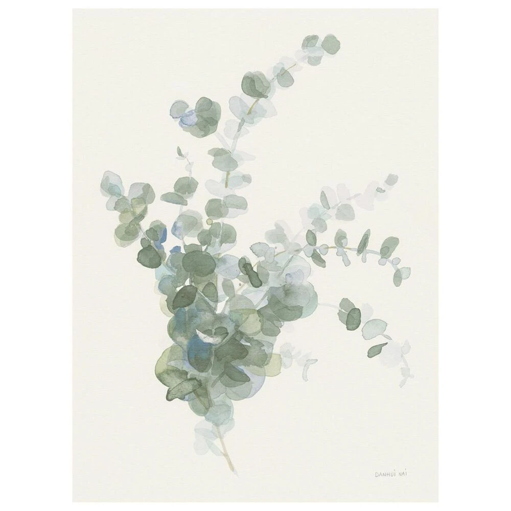 - This ready to hang, gallery-wrapped art piece features a green eucalyptus branch against a cream background.