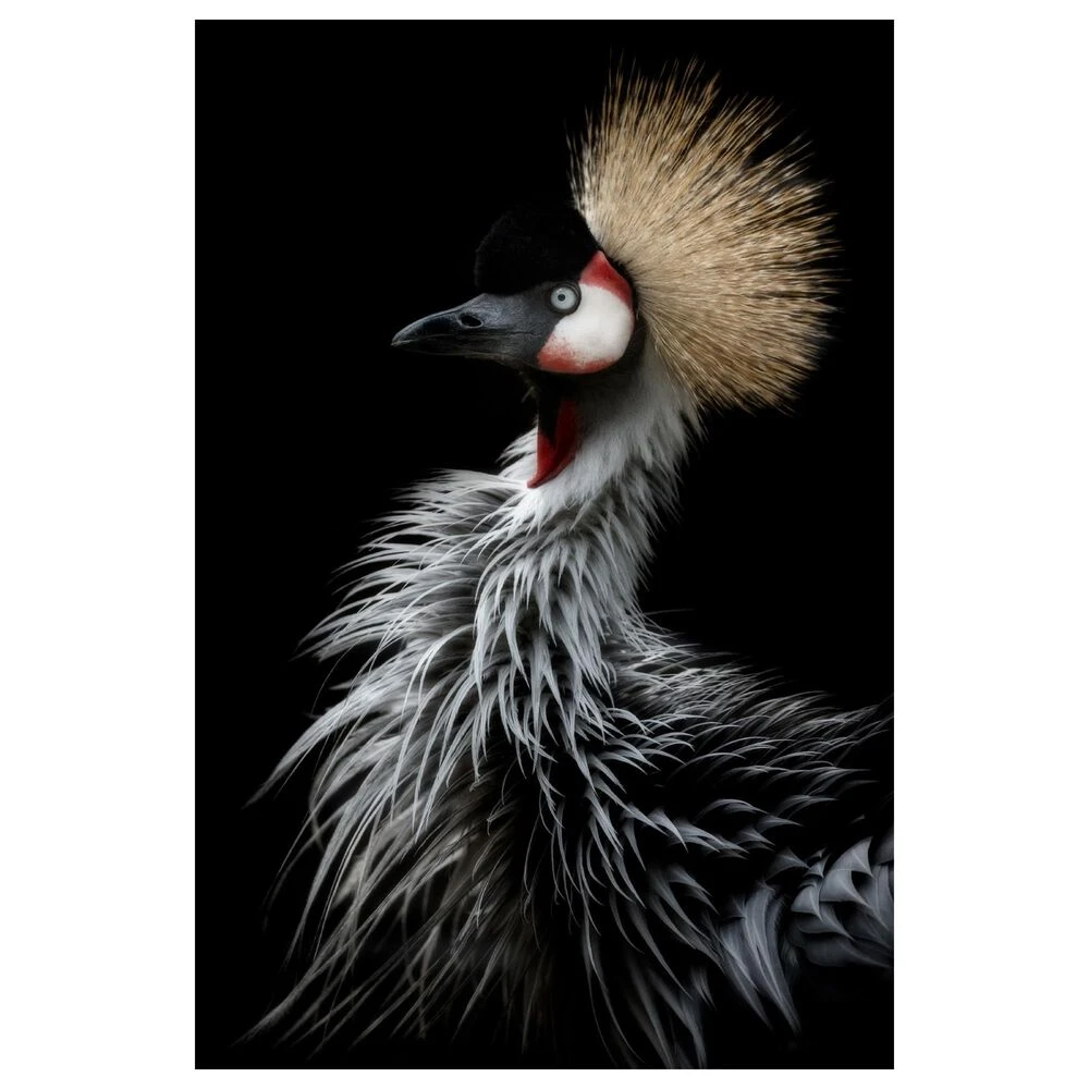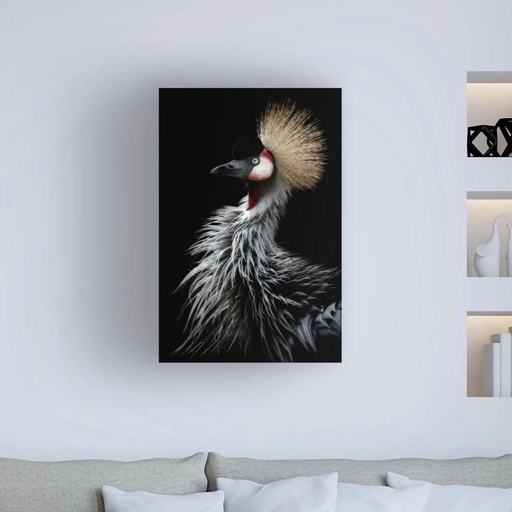 This ready to hang, gallery-wrapped art piece features a portrait of a crane over a black background.