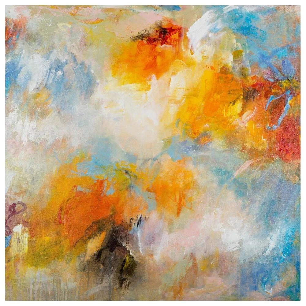 - This ready to hang, gallery-wrapped art piece features orange, blue, and white abstract paint filling the frame.