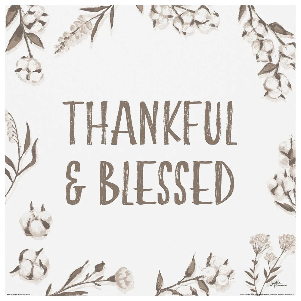 - This ready to hang, gallery-wrapped art piece features “thankful and blessed” text with neutral floral border.