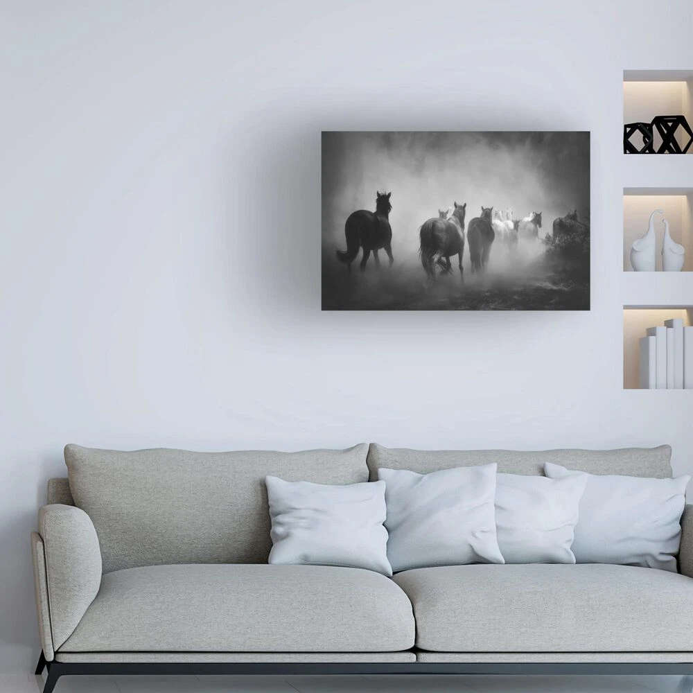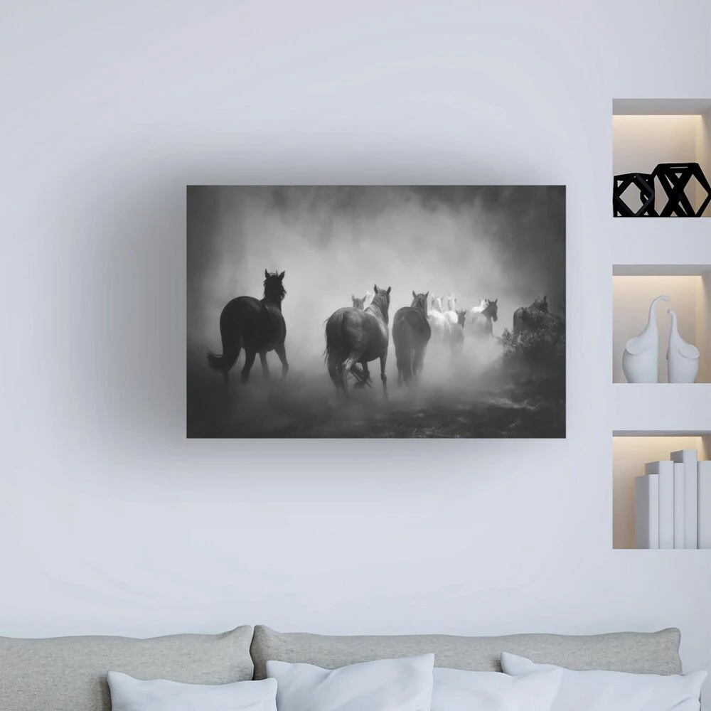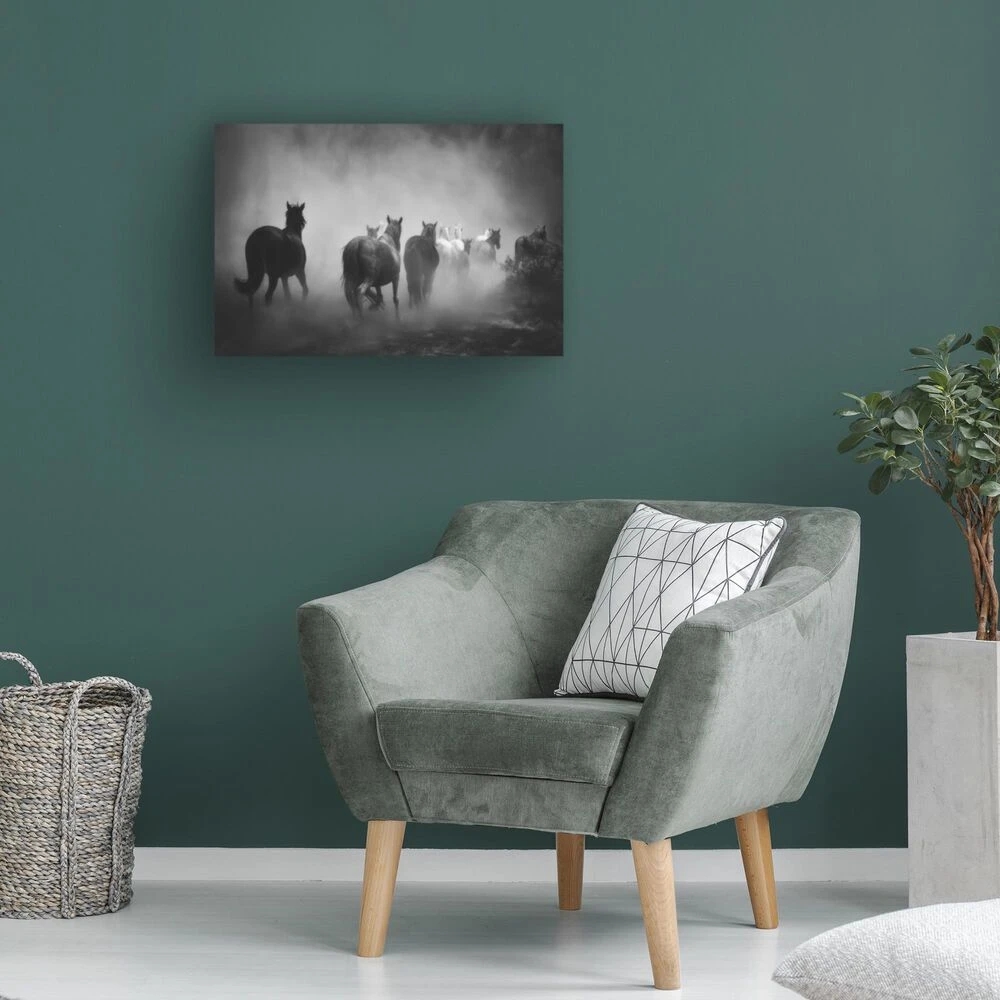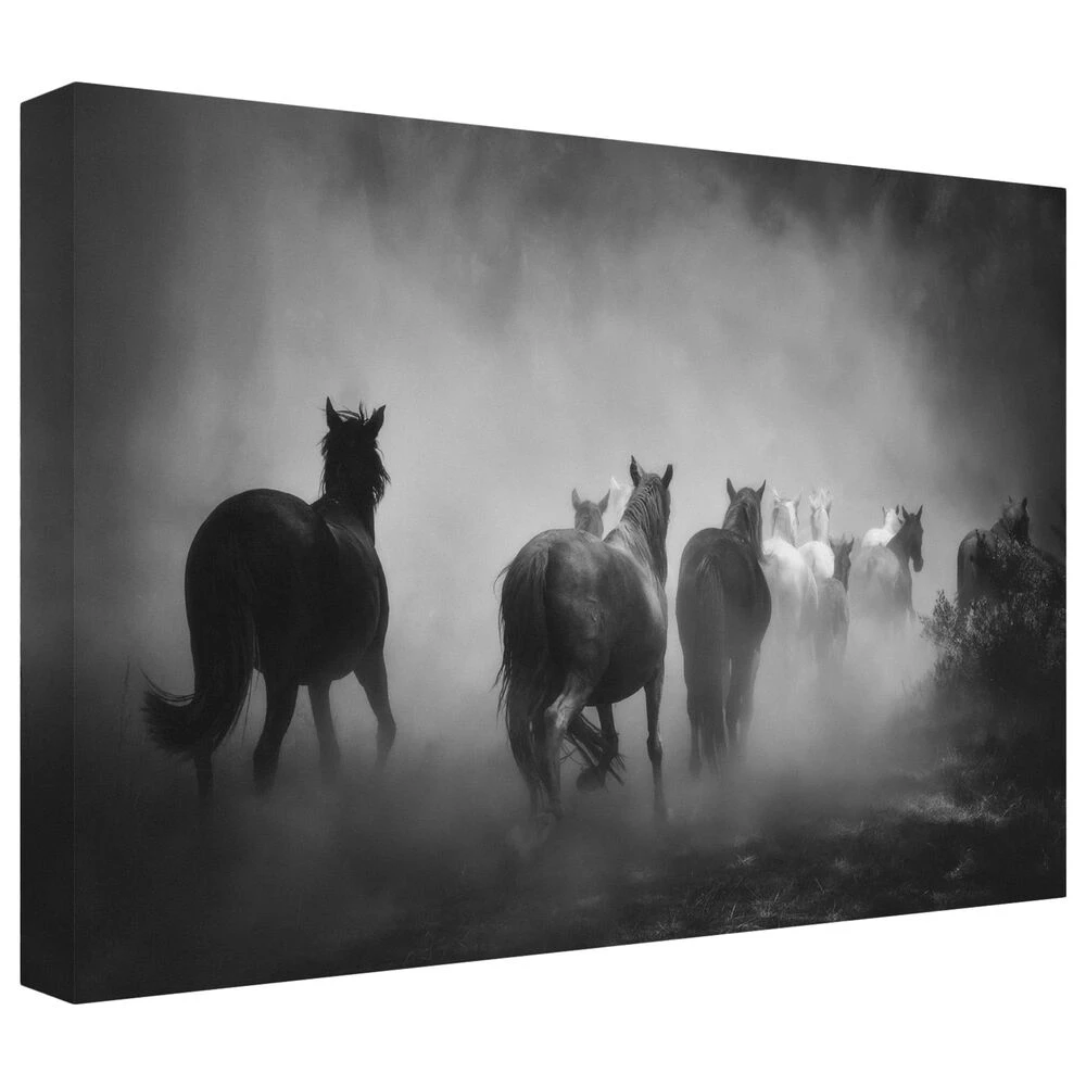 This ready to hang, gallery-wrapped art piece features horses running through a foggy scene.