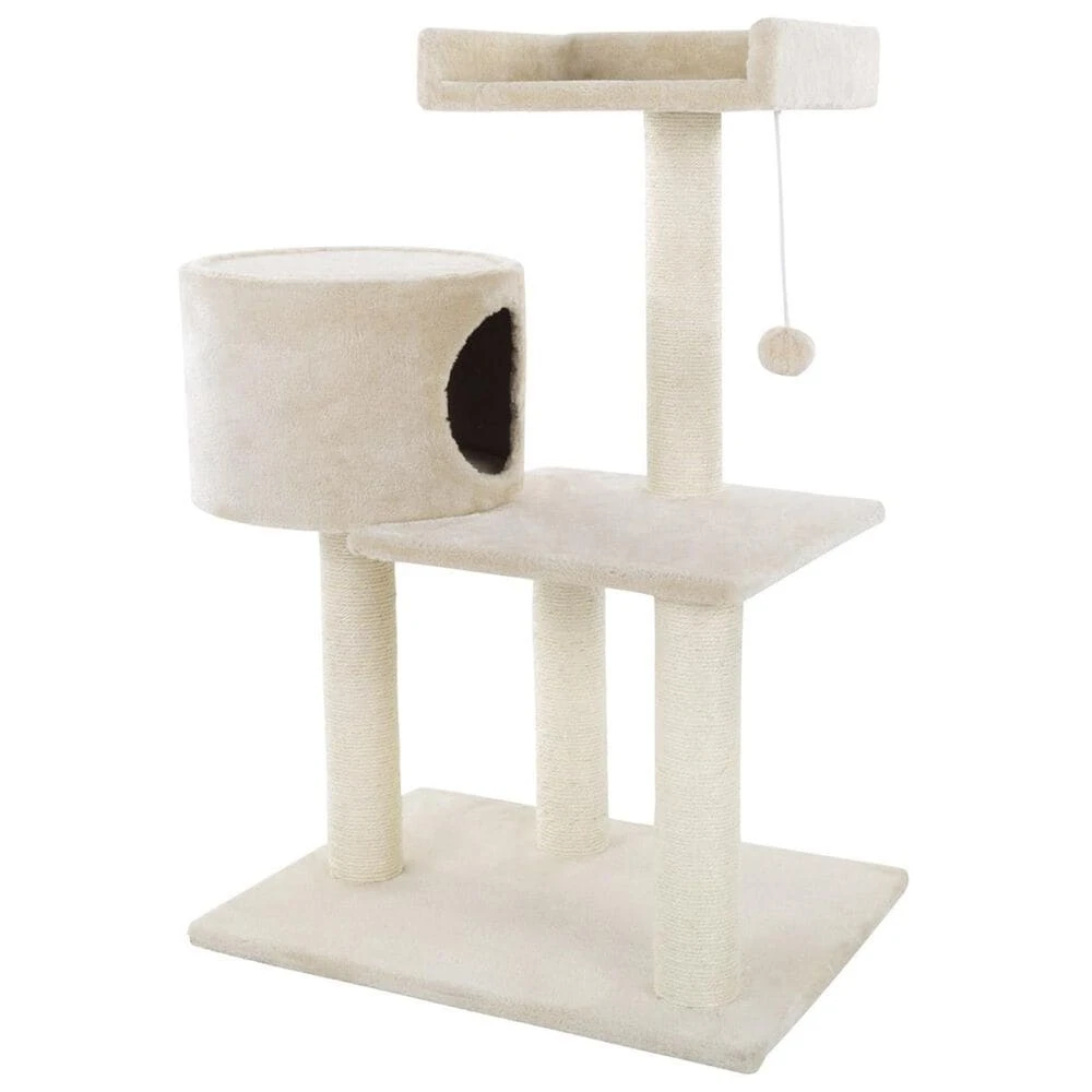 Give your cat or kitten the perfect place to nap, scratch, and play with the unique 3 Tier Cat Tree by PETMAKER. This attractive cat activity tower features multiple scratching posts, an upper deck viewing perch, a hanging toy, a comfortable condo for hiding, and two platforms for lounging to offer your cat their own slice of kitty paradise! It is easy to assemble for convenience and is covered in soft plush fabric for maximum comfort for your cat!