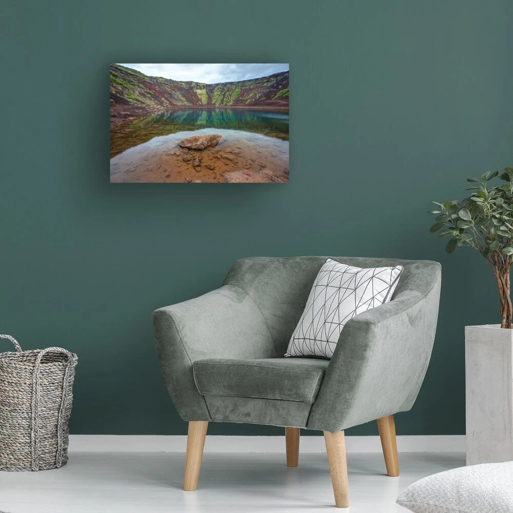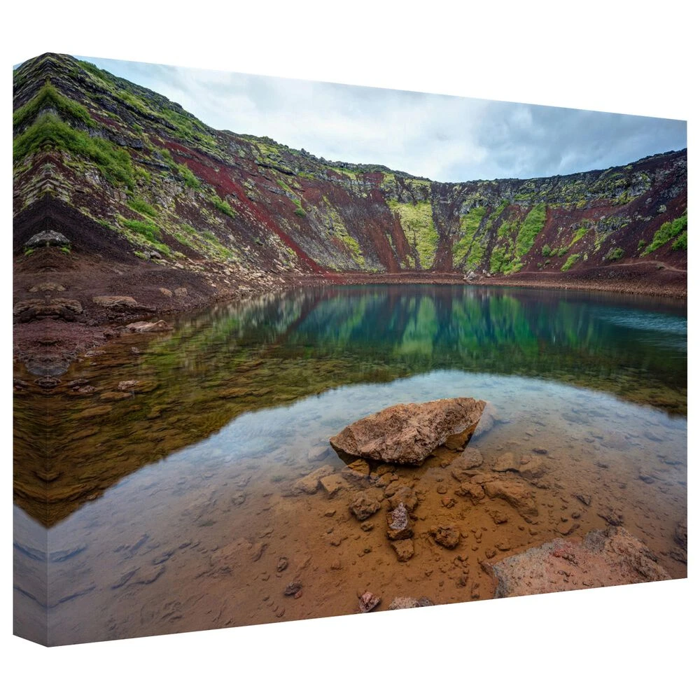- This ready to hang, gallery-wrapped art piece features rocks on a beach under a sunrise.