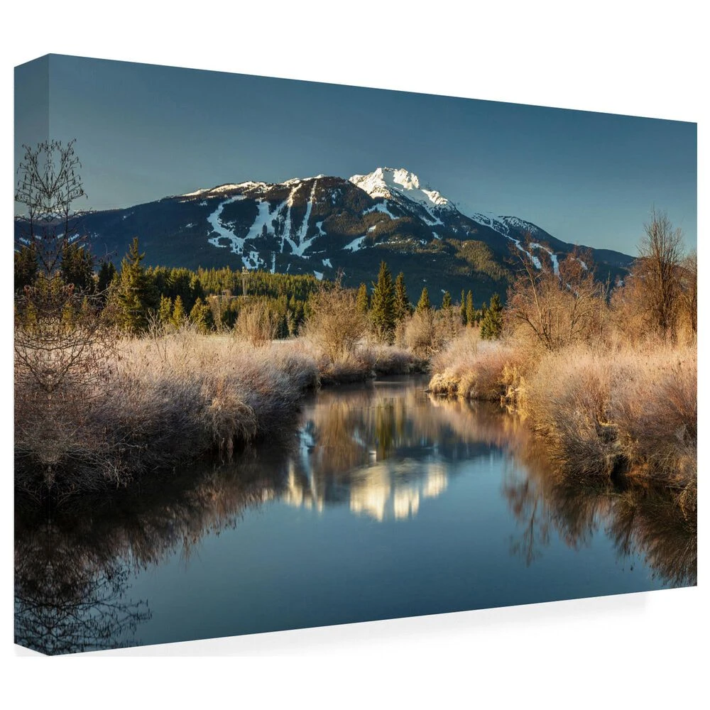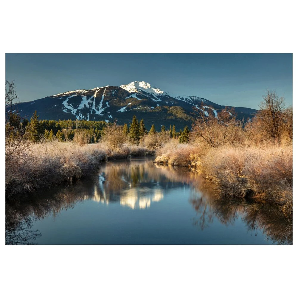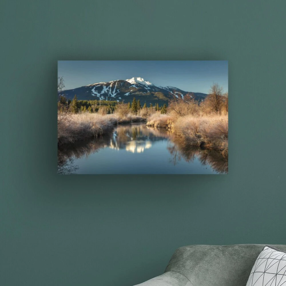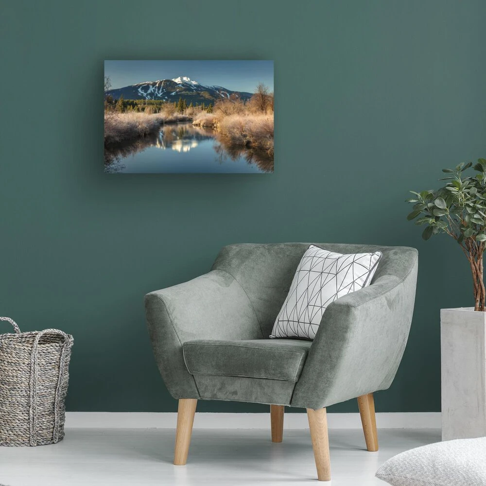 - This ready to hang, gallery-wrapped art piece features a snowcapped mountain in the center of the frame.