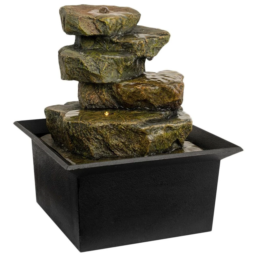 - WARM LED LIGHT: The fountain cascades water over 5 tiers of natural looking rock formations and features a quiet, built-in pump that is completely submersed in water along with a warm white LED light to create a calming, Zen-like atmosphere.