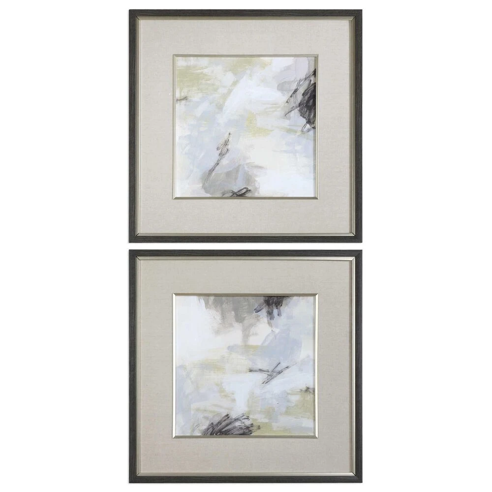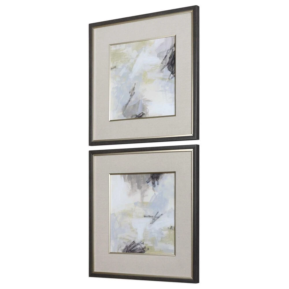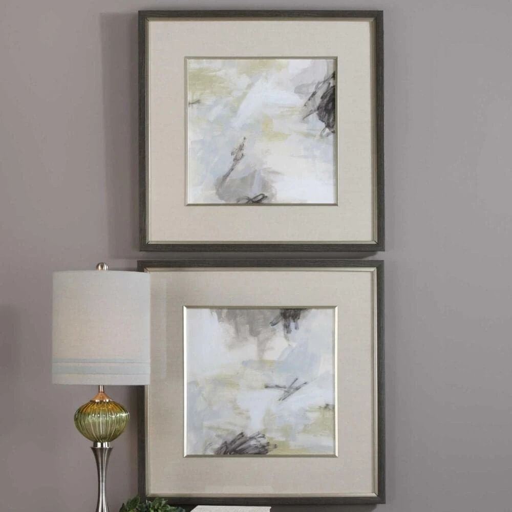 Pale Pastels Create A Calming Abstract Art Set. Muted Shades Of Blue, Green, White, And Charcoal Make Up These Contemporary Pieces. Each Print Is Accented By An Oatmeal Linen Mat. Frames With A Faux Wood Grain Finish And Charcoal Coloring Are Paired With Matching Silver Champagne Inner Lips And Fillets. Each Print Is Placed Under Protective Glass.