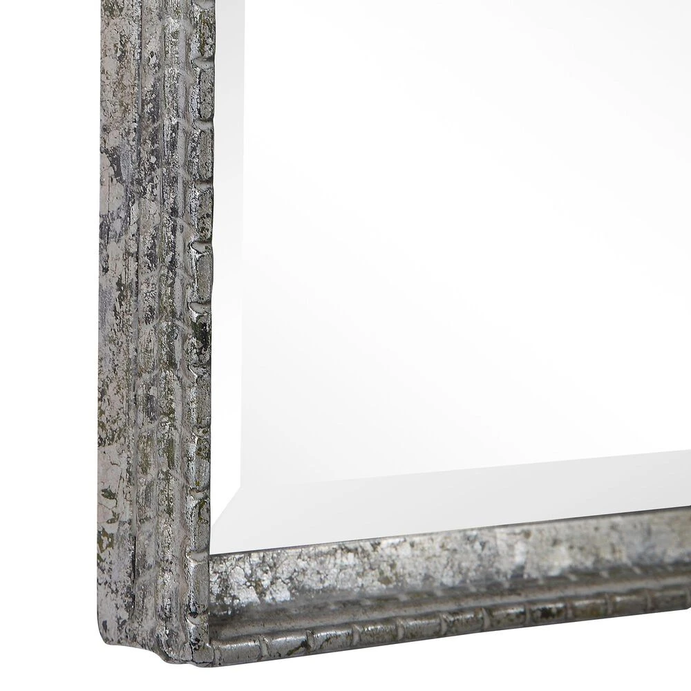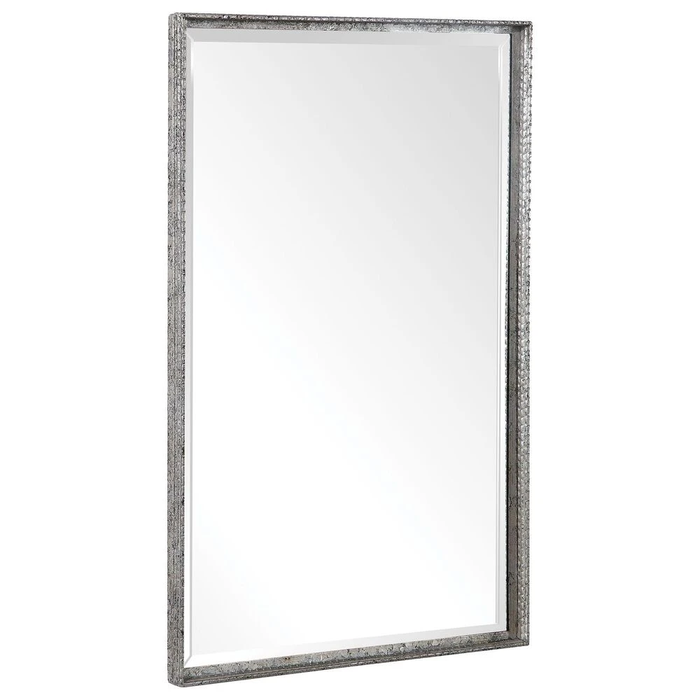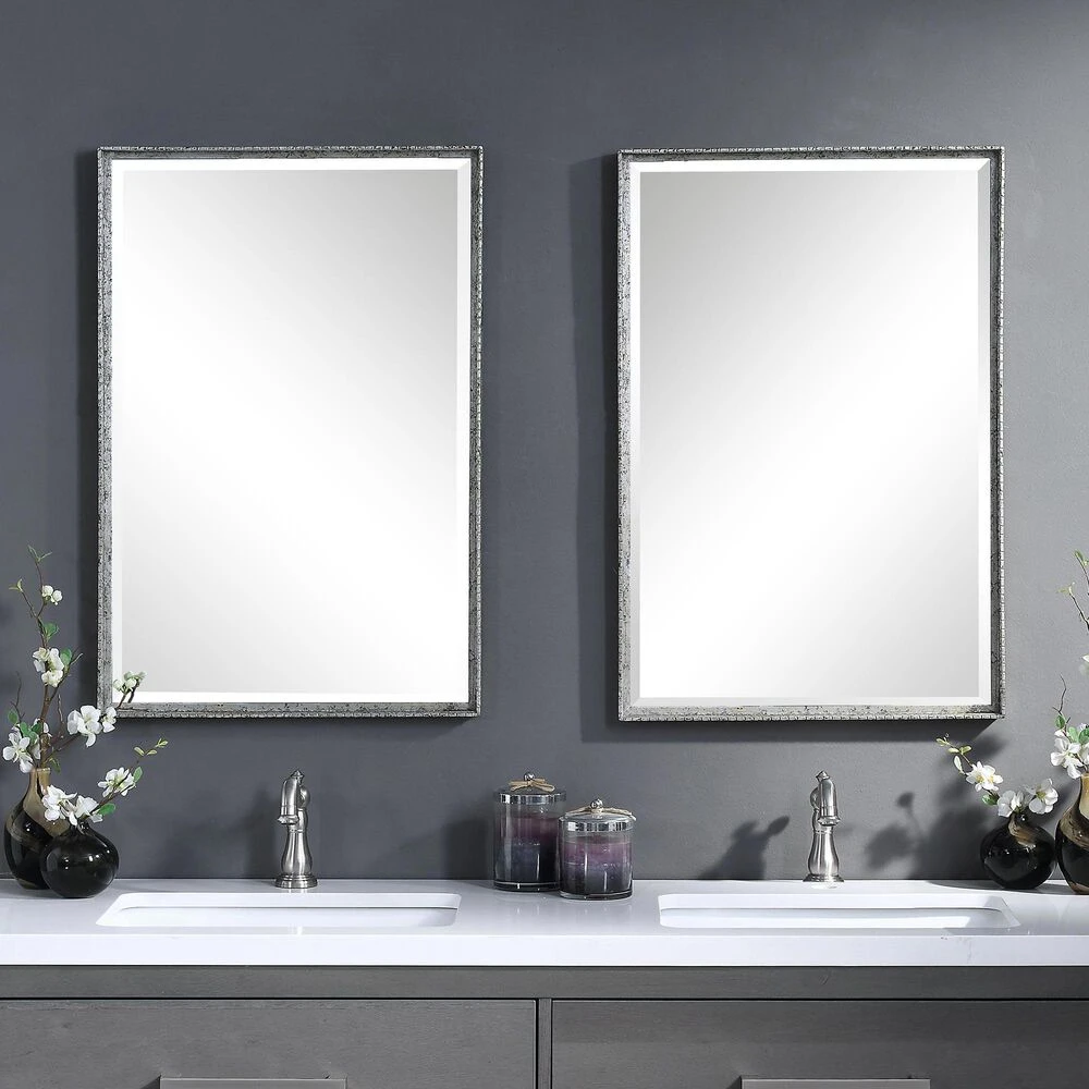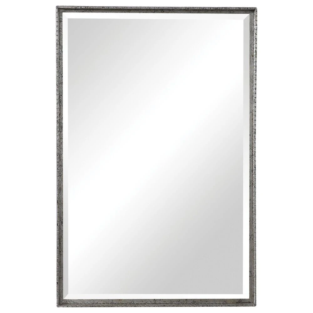 This Simple Vanity Mirror Features An Iron Construction With Detailed Edges. The Slight Profile Frame Is Finished In A Distressed Aged Silver. This Mirror May Be Hung Horizontal Or Vertical.