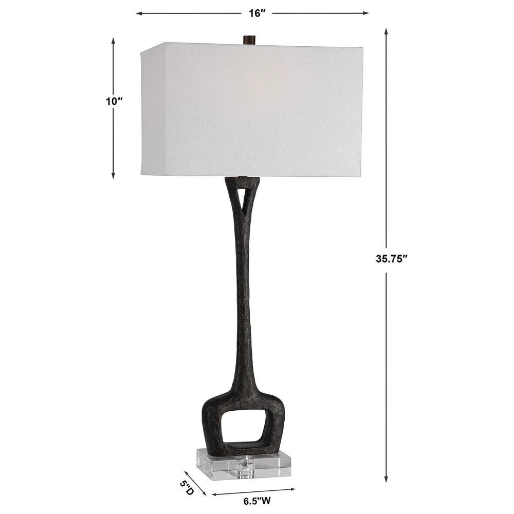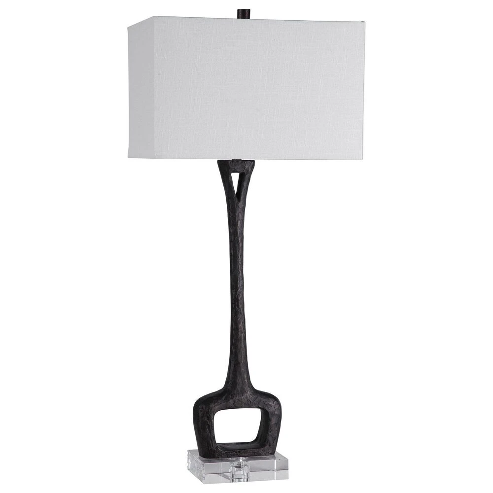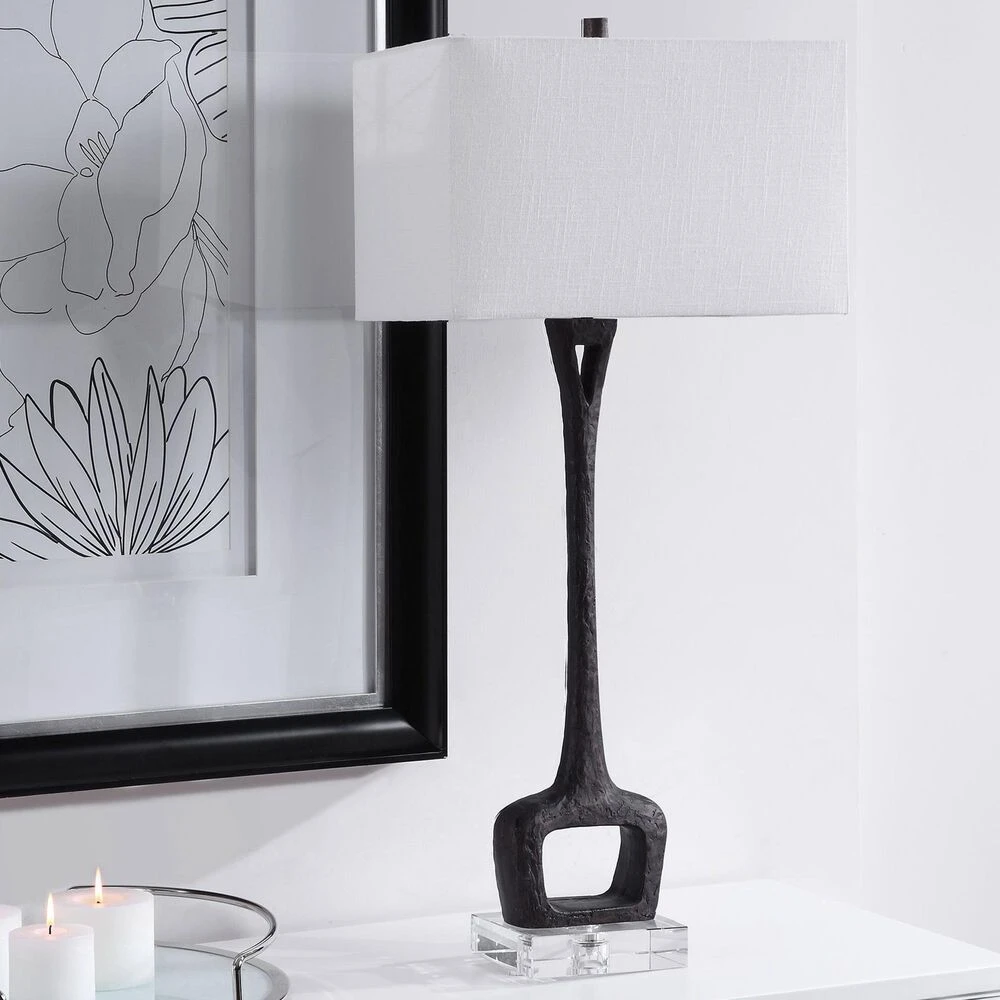 This Cast Iron Table Lamp Is Finished In A Masculine Aged Black With A Heavy Organic Texture Displayed On An Elegant Crystal Foot. The Lamp Is Paired With A Rectangular Hardback Shade In A White Linen Fabric With Vertical Slubbing.