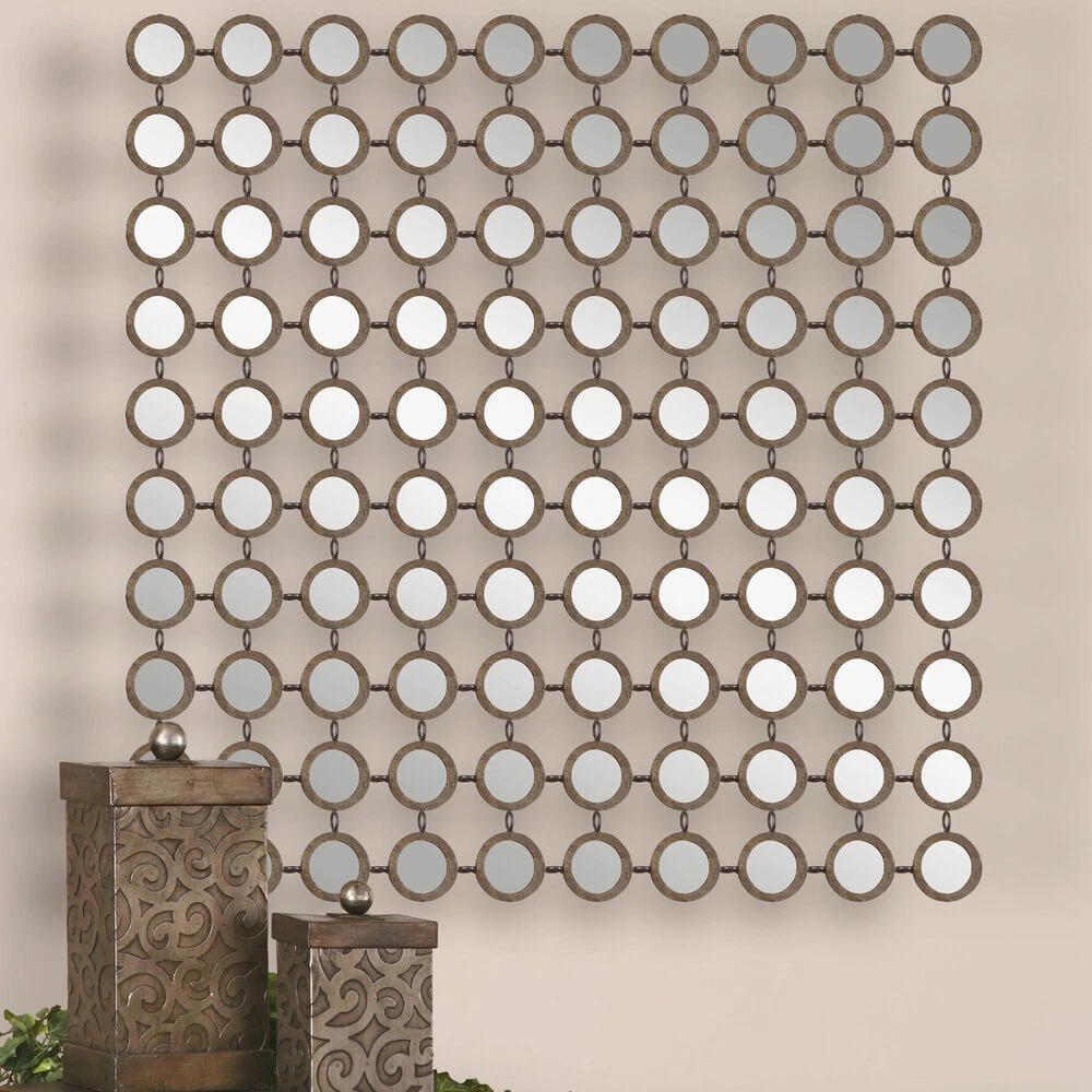 Numerous, Small Round Mirrors Are Joined By Hand Forged Metal To Create This Mirror. Finish Is Lightly Antiqued Silver Champagne Leaf.