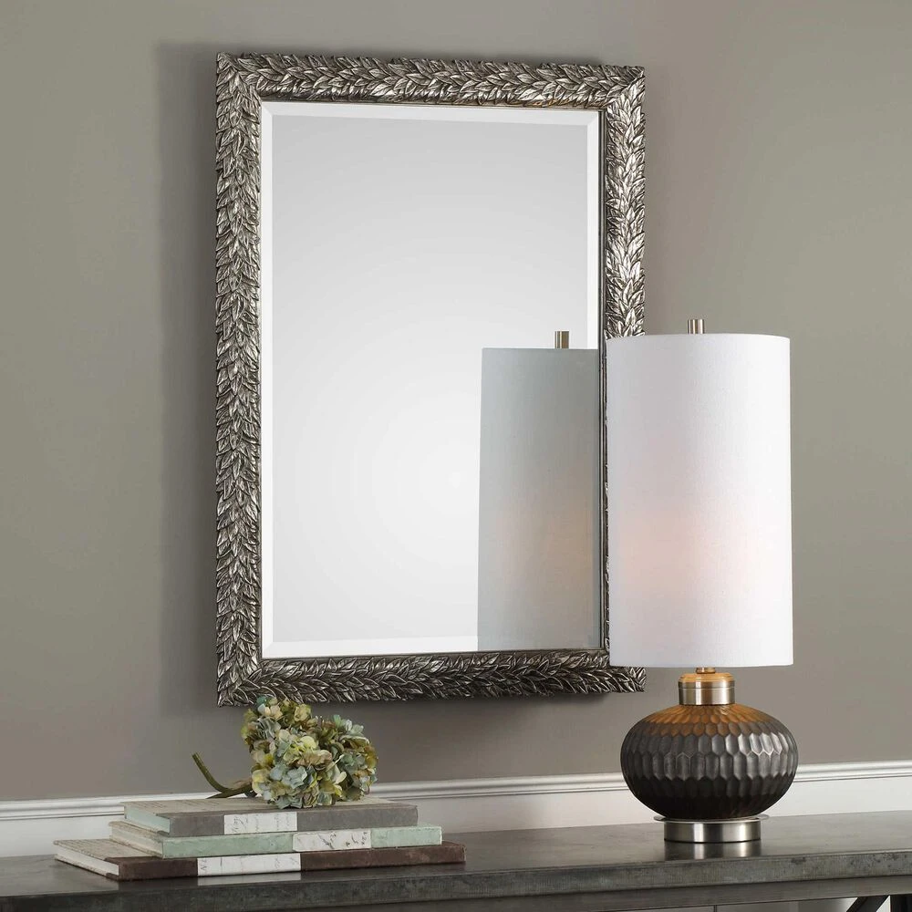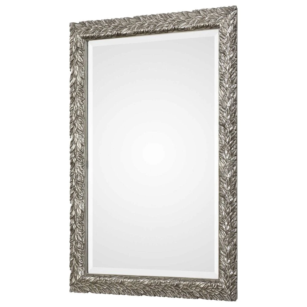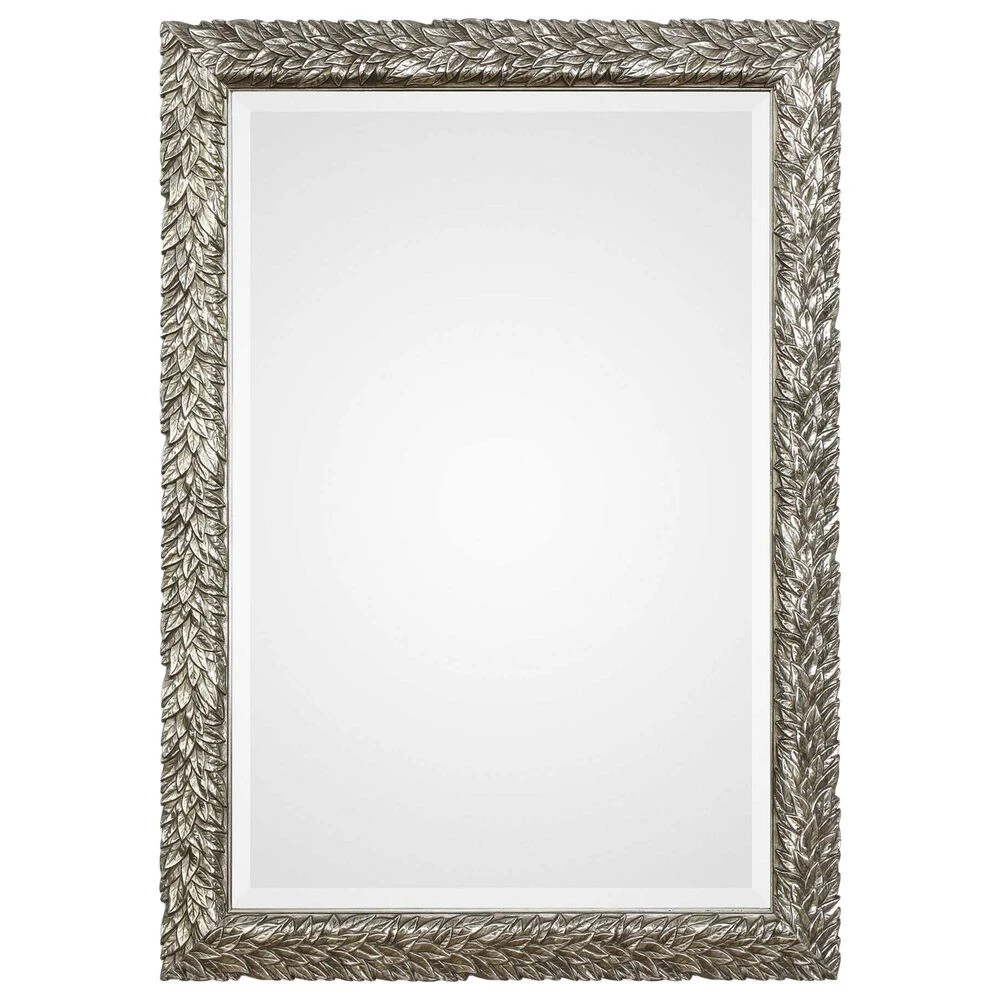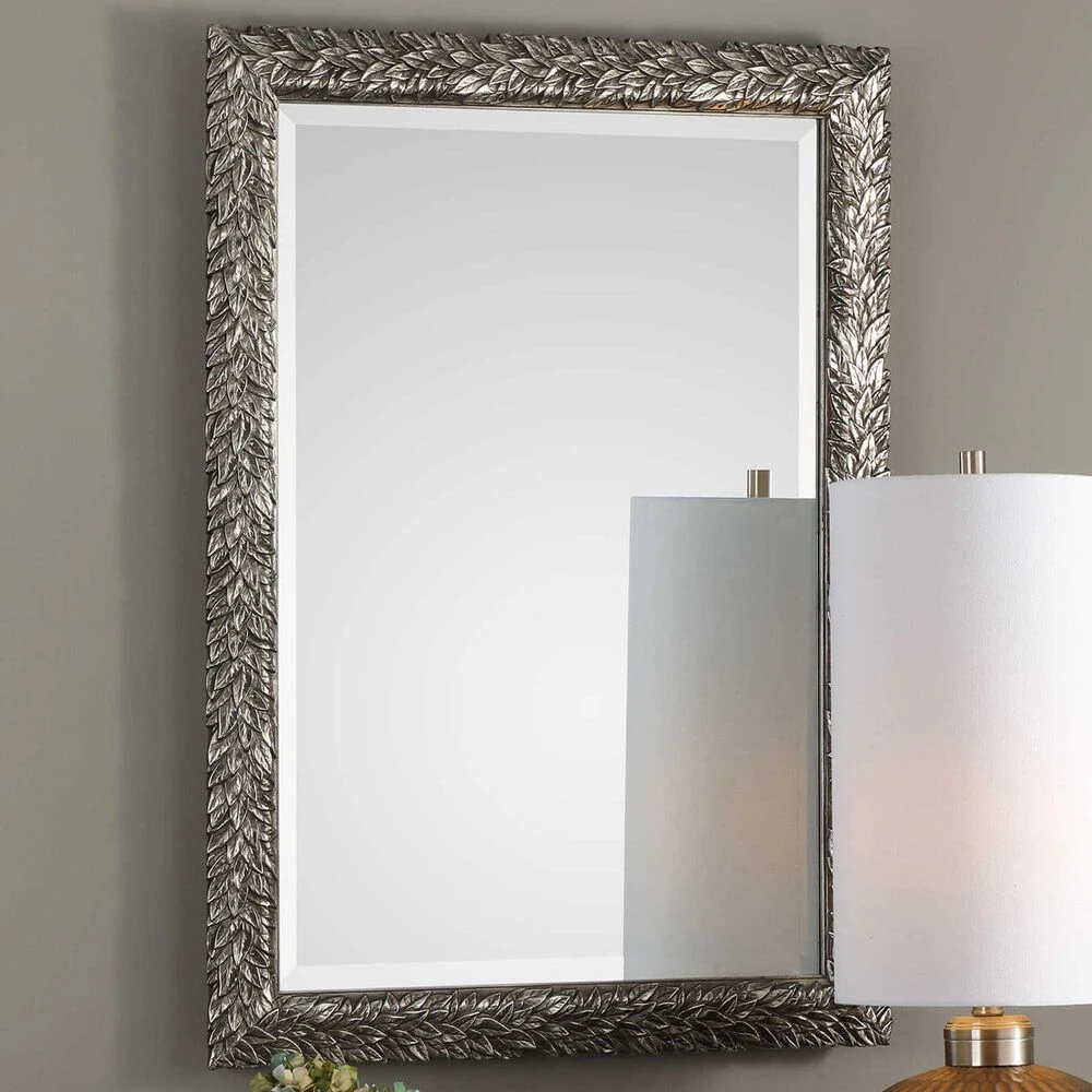 This Flowing Leaf Design Features A Delicate, 3-dimensional Texture, Finished In A Lightly Burnished Metallic Silver. Mirror Is Beveled. May Be Hung Horizontal Or Vertical.