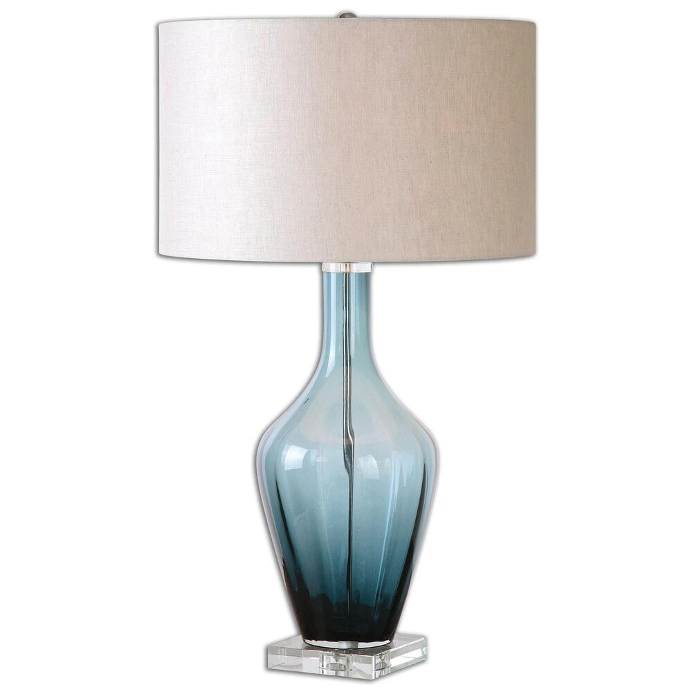 Translucent, Dark Azure Blue Glass Accented With Crystal Details. The Round Hardback Drum Shade Is A Beige Linen Fabric With Natural Slubbing.