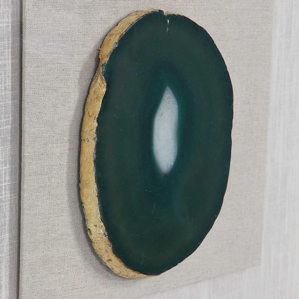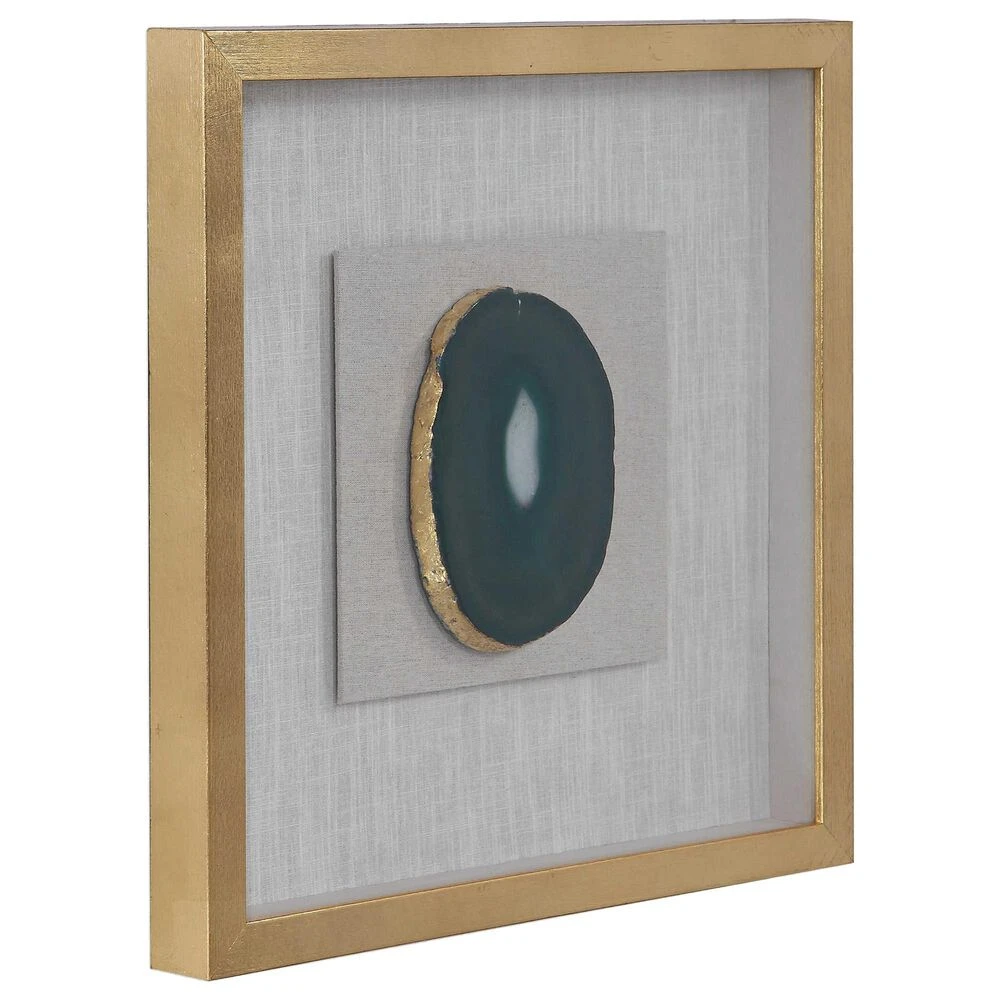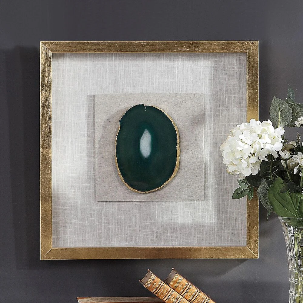 A Pine Wood Shadow Box Featuring A Hand Applied Gold Leaf Finish Showcases A Striking Emerald Green Agate Stone With White Veining, Accented With Hand Painted Gold Edging. Mounted On An Off-white Linen Backing.
