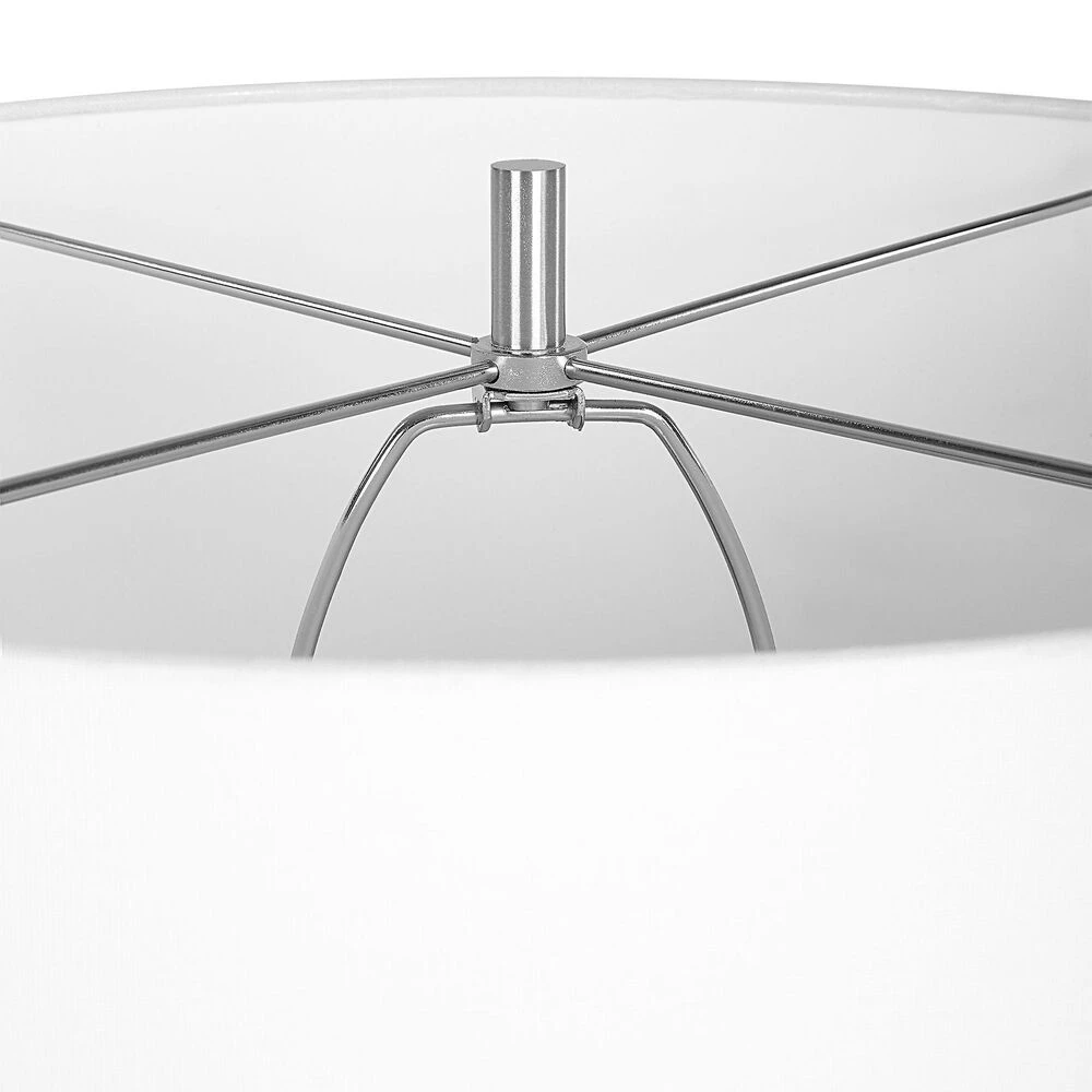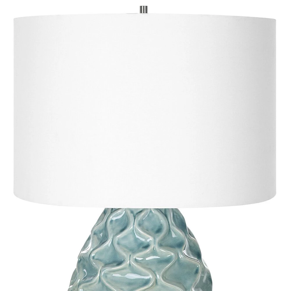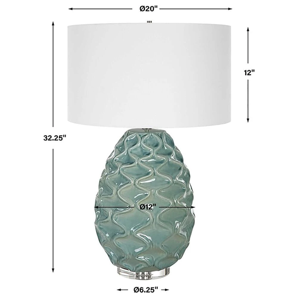The Laced Up Table Lamp is handcrafted from ceramic with unique raised ribbon details in a sea foam gloss glaze atop a thick crystal foot. The lamp is complemented by a white linen drum shade.