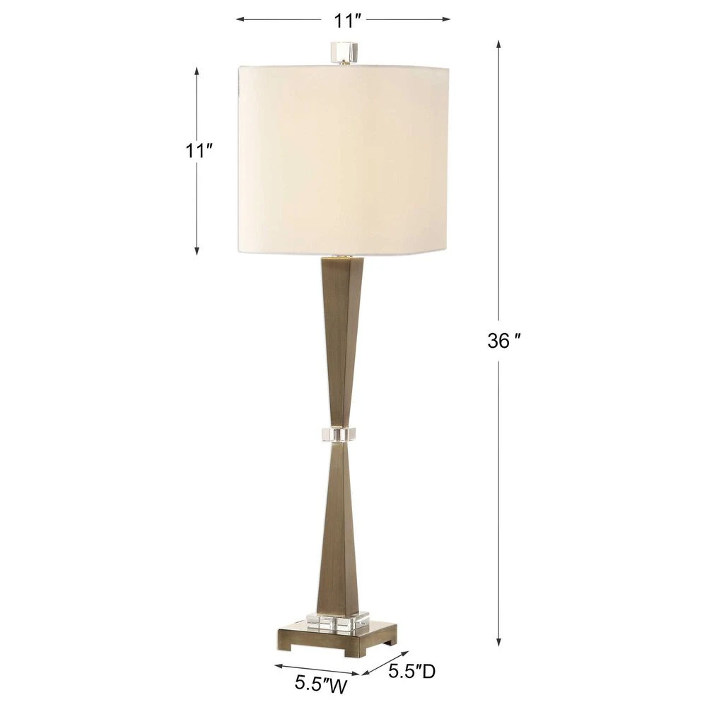 This Sleek Design Features Tapered Steel Columns, Finished In Plated, Lightly Antiqued Brushed Brass, Accented With Thick Crystal Details. The Square Hardback Shade Is A White Linen Fabric With Rolled Edges.