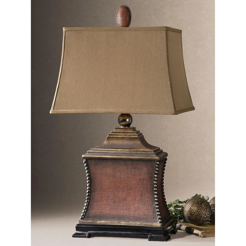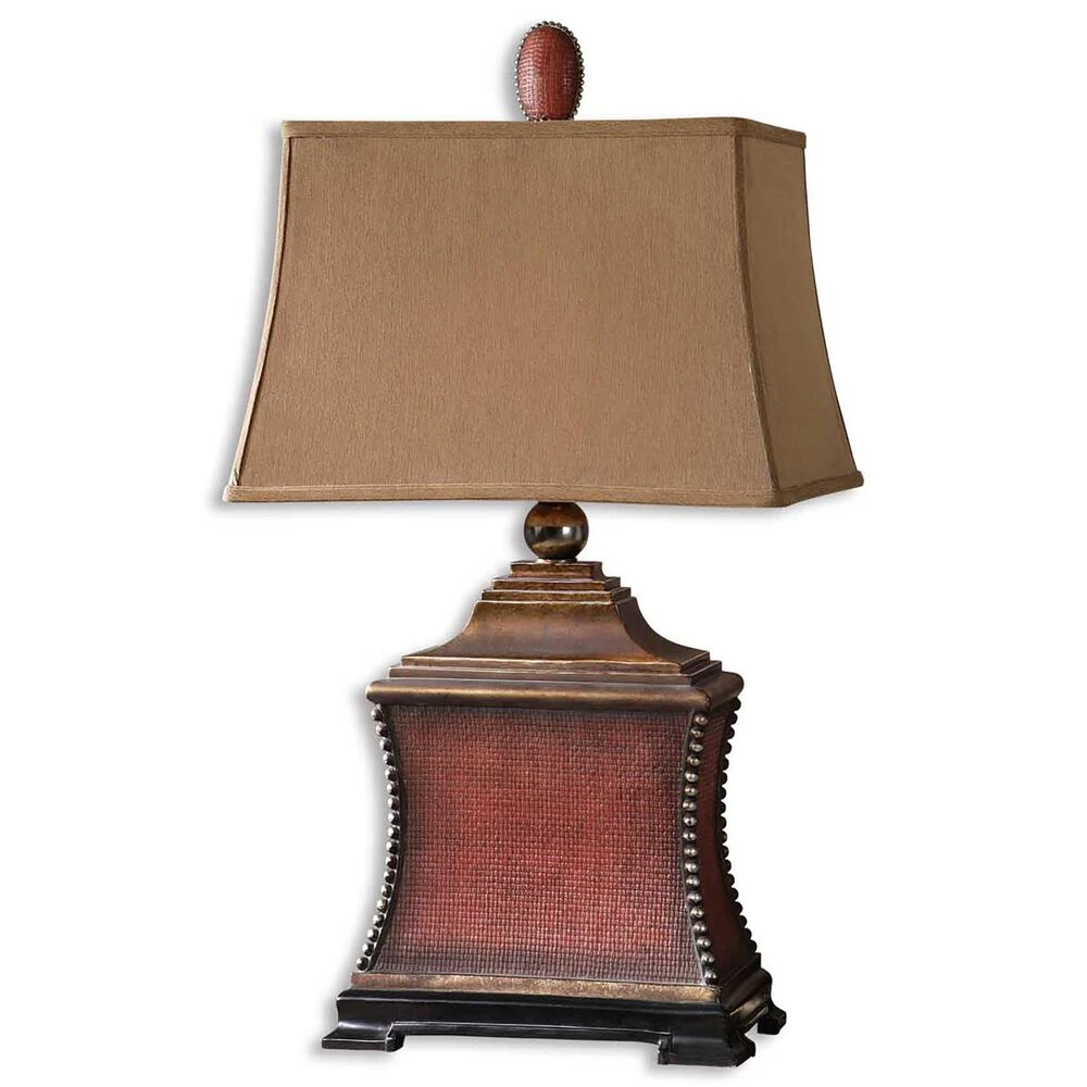 Aged Red Finish Over A Woven Textured Base With Antiqued Silver Beaded Accents, Matte Black Foot And Heavily Antiqued Gold Details. The Rectangle, Semi Bell Shade Is A Silken Rust Taupe Fabric.
