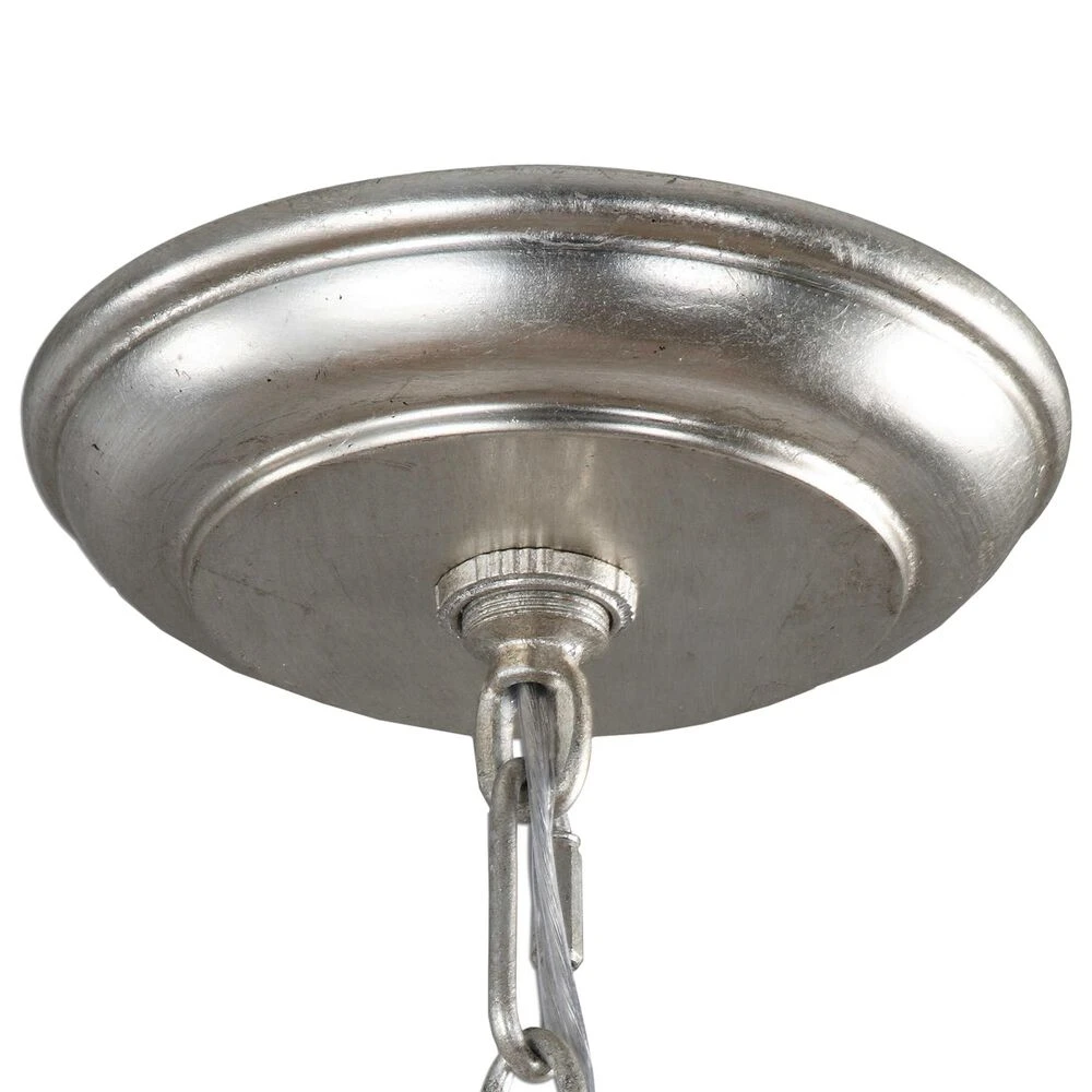 Burnished Silver Champagne Leaf Finish With Modern Clear Crystal Accents Highlight This Majestic Chandelier Along With Silken Off White Hardback Shades.